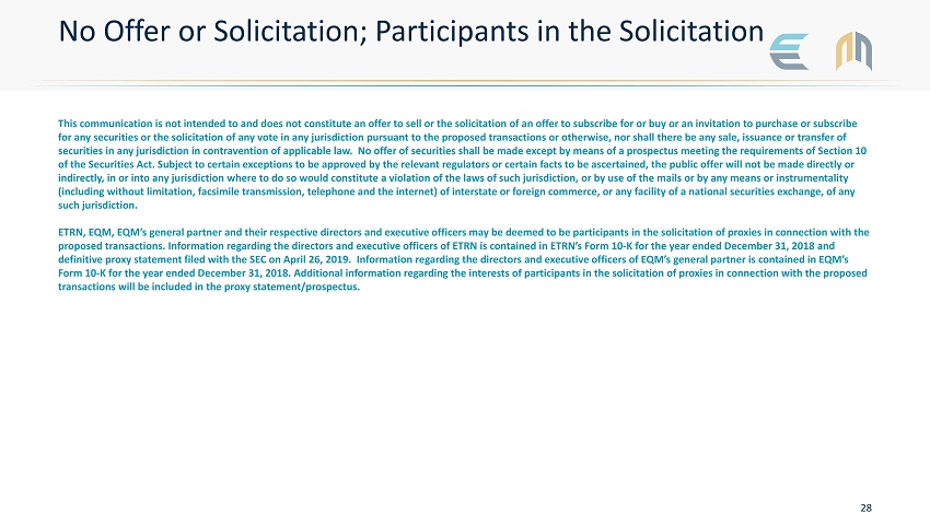No Offer or Solicitation; Participants in the Solicitation 28 This communication is not intended to and does not constitute an offer to sell or the solicitation of an offer to subscribe f or or buy or an invitation to purchase or subscribe for any securities or the solicitation of any vote in any jurisdiction pursuant to the proposed transactions or otherwise, no r s hall there be any sale, issuance or transfer of securities in any jurisdiction in contravention of applicable law. No offer of securities shall be made except by means of a pr ospectus meeting the requirements of Section 10 of the Securities Act. Subject to certain exceptions to be approved by the relevant regulators or certain facts to be ascerta ine d, the public offer will not be made directly or indirectly, in or into any jurisdiction where to do so would constitute a violation of the laws of such jurisdiction, or by u se of the mails or by any means or instrumentality (including without limitation, facsimile transmission, telephone and the internet) of interstate or foreign commerce, or any fac ility of a national securities exchange, of any such jurisdiction. ETRN, EQM, EQM’s general partner and their respective directors and executive officers may be deemed to be participants in th e s olicitation of proxies in connection with the proposed transactions. Information regarding the directors and executive officers of ETRN is contained in ETRN’s Form 10 - K for t he year ended December 31, 2018 and definitive proxy statement filed with the SEC on April 26, 2019. Information regarding the directors and executive officers of EQM’s general partner is contained in EQM’s Form 10 - K for the year ended December 31, 2018. Additional information regarding the interests of participants in the solicitati on of proxies in connection with the proposed transactions will be included in the proxy statement/prospectus.