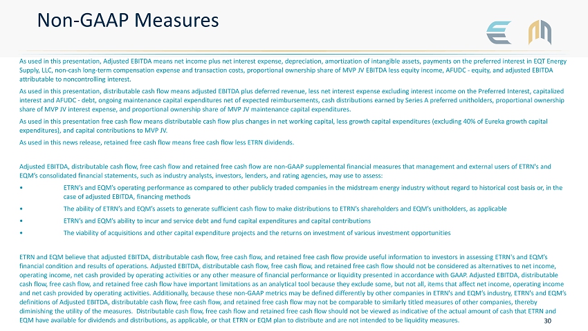 As used in this presentation, Adjusted EBITDA means net income plus net interest expense, depreciation, amortization of intan gib le assets, payments on the preferred interest in EQT Energy Supply, LLC, non - cash long - term compensation expense and transaction costs, proportional ownership share of MVP JV EBITDA less e quity income, AFUDC - equity, and adjusted EBITDA attributable to noncontrolling interest. As used in this presentation, distributable cash flow means adjusted EBITDA plus deferred revenue, less net interest expense exc luding interest income on the Preferred Interest, capitalized interest and AFUDC - debt, ongoing maintenance capital expenditures net of expected reimbursements, cash distributions earned by Series A preferred unitholders, proportional ownership share of MVP JV interest expense, and proportional ownership share of MVP JV maintenance capital expenditures. As used in this presentation free cash flow means distributable cash flow plus changes in net working capital, less growth ca pit al expenditures (excluding 40% of Eureka growth capital expenditures), and capital contributions to MVP JV. As used in this news release, retained free cash flow means free cash flow less ETRN dividends. Adjusted EBITDA, distributable cash flow, free cash flow and retained free cash flow are non - GAAP supplemental financial measure s that management and external users of ETRN's and EQM’s consolidated financial statements, such as industry analysts, investors, lenders, and rating agencies, may use to asses s: • ETRN’s and EQM’s operating performance as compared to other publicly traded companies in the midstream energy industry withou t regard to historical cost basis or, in the case of adjusted EBITDA, financing methods • The ability of ETRN’s and EQM’s assets to generate sufficient cash flow to make distributions to ETRN’s shareholders and EQM’ s unitholders, as applicable • ETRN’s and EQM’s ability to incur and service debt and fund capital expenditures and capital contributions • The viability of acquisitions and other capital expenditure projects and the returns on investment of various investment oppo rtunities ETRN and EQM believe that adjusted EBITDA, distributable cash flow, free cash flow, and retained free cash flow provide usefu l i nformation to investors in assessing ETRN's and EQM’s financial condition and results of operations. Adjusted EBITDA, distributable cash flow, free cash flow, and retained free ca sh flow should not be considered as alternatives to net income, operating income, net cash provided by operating activities or any other measure of financial performance or liquidity presen ted in accordance with GAAP. Adjusted EBITDA, distributable cash flow, free cash flow, and retained free cash flow have important limitations as an analytical tool because they exclude som e, but not all, items that affect net income, operating income and net cash provided by operating activities. Additionally, because these non - GAAP metrics may be defined differently by other companies in ETRN's and EQM’s industry, ETRN's and EQM’s definitions of Adjusted EBITDA, distributable cash flow, free cash flow, and retained free cash flow may not be comparable to si milarly titled measures of other companies, thereby diminishing the utility of the measures. Distributable cash flow, free cash flow and retained free cash flow should not be v iew ed as indicative of the actual amount of cash that ETRN and EQM have available for dividends and distributions, as applicable, or that ETRN or EQM plan to distribute and are not intende d t o be liquidity measures. Non - GAAP Measures 30