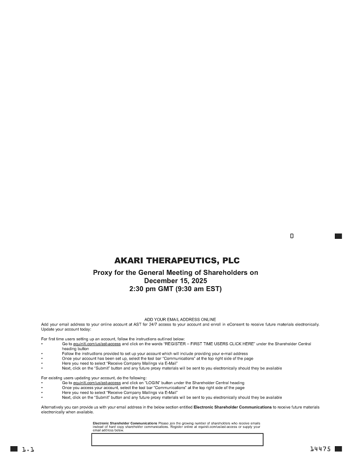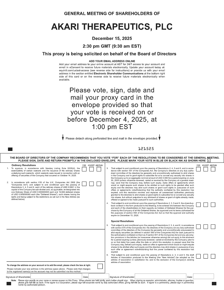 NOTICE is hereby given that a general meeting of shareholders of Akari Therapeutics, Plc (“Akari”, the “Company,” “our” or “we”), a public limited company incorporated under the laws of England and Wales, will be held at 2:30 p.m. London time (9.30 a.m. Eastern Time) on December 15, 2025, at 75/76 Wimpole Street, London W1G 9RT, (the “Meeting”), for the purpose of considering and, if thought fit, passing the following resolutions (the “Resolutions”):