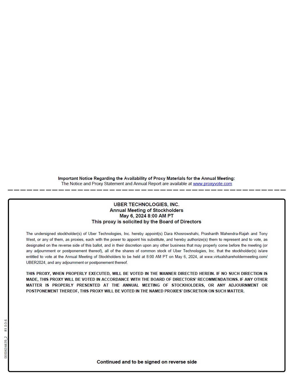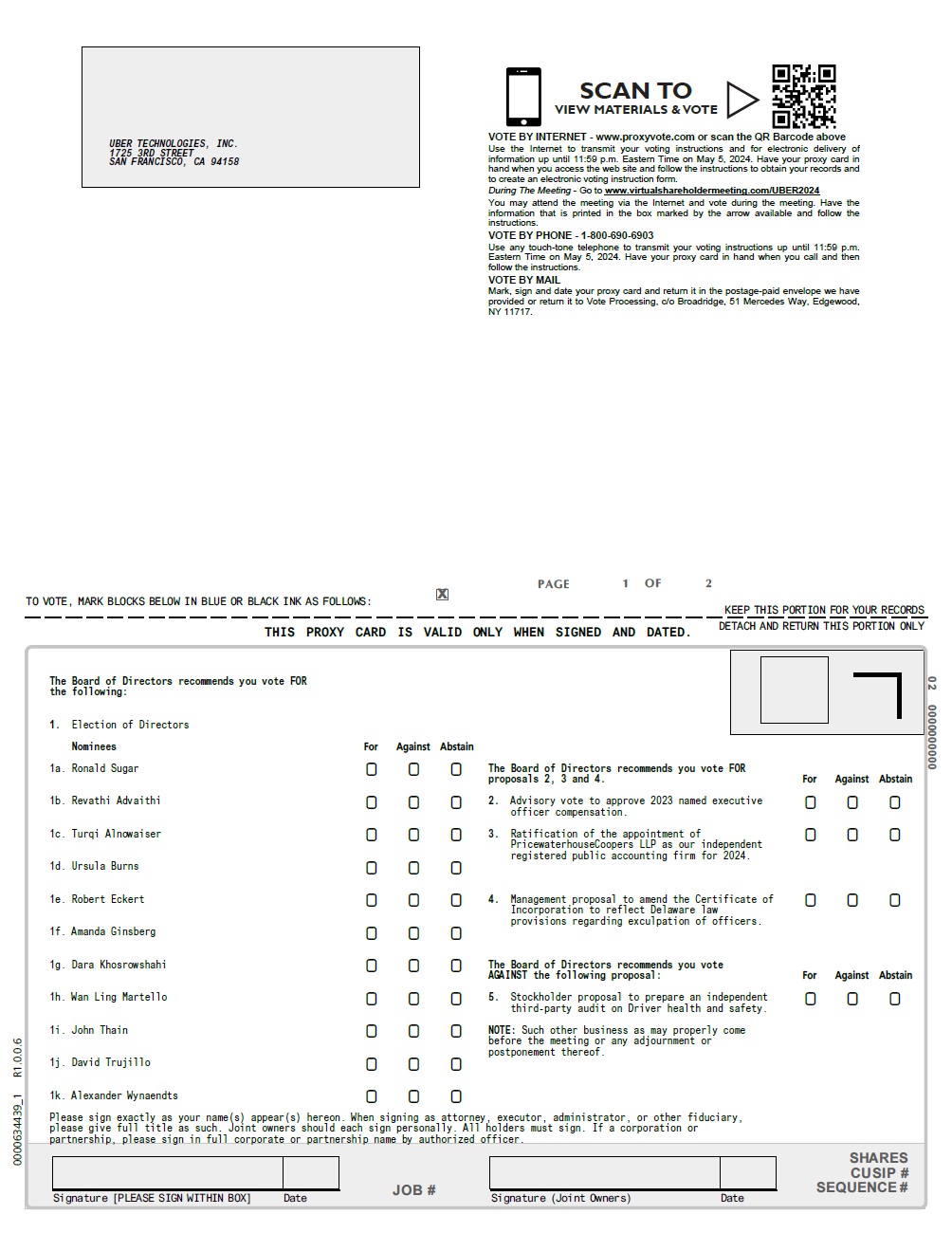 x 02 0000000000 JOB # 1 OF 2 PAGE SHARES CUSIP # SEQUENCE # THIS PROXY CARD IS VALID ONLY WHEN SIGNED AND DATED. KEEP THIS PORTION FOR YOUR RECORDS DETACH AND RETURN THIS PORTION ONLY TO VOTE, MARK BLOCKS BELOW IN BLUE OR BLACK INK AS FOLLOWS: Signature [PLEASE SIGN WITHIN BOX] Date Signature (Joint Owners) Date SCAN TO VIEW MATERIALS & VOTE 0 0 0 0 0 0 0 0 0 0 0 0 0 0 0 0 0 0 0 0 0 0 0 0 0 0 0 0 0 0 0 0 0 0 0 0 0 0 0 0 0 0 0 0 0 0000634439_1 R1.0.0.6 UBER TECHNOLOGIES, INC. 1725 3RD STREET SAN FRANCISCO, CA 94158 VOTE BY INTERNET - www.proxyvote.com or scan the QR Barcode above Use the Internet to transmit your voting instructions and for electronic delivery of information up until 11:59 p.m. Eastern Time on May 5, 2024. Have your proxy card in hand when you access the web site and follow the instructions to obtain your records and to create an electronic voting instruction form. During The Meeting - Go to www.virtualshareholdermeeting.com/UBER2024 You may attend the meeting via the Internet and vote during the meeting. Have the information that is printed in the box marked by the arrow available and follow the instructions. VOTE BY PHONE - 1-800-690-6903 Use any touch-tone telephone to transmit your voting instructions up until 11:59 p.m. Eastern Time on May 5, 2024. Have your proxy card in hand when you call and then follow the instructions. VOTE BY MAIL Mark, sign and date your proxy card and return it in the postage-paid envelope we have provided or return it to Vote Processing, c/o Broadridge, 51 Mercedes Way, Edgewood, NY 11717. The Board of Directors recommends you vote FOR the following: 1. Election of Directors Nominees For Against Abstain 1a. Ronald Sugar 1b. Revathi Advaithi 1c. Turqi Alnowaiser 1d. Ursula Burns 1e. Robert Eckert 1f. Amanda Ginsberg 1g. Dara Khosrowshahi 1h. Wan Ling Martello 1i. John Thain 1j. David Trujillo 1k. Alexander Wynaendts The Board of Directors recommends you vote FOR proposals 2, 3 and 4. For Against Abstain 2. Advisory vote to approve 2023 named executive officer compensation. 3. Ratification of the appointment of PricewaterhouseCoopers LLP as our independent registered public accounting firm for 2024. 4. Management proposal to amend the Certificate of Incorporation to reflect Delaware law provisions regarding exculpation of officers. The Board of Directors recommends you vote AGAINST the following proposal: For Against Abstain 5. Stockholder proposal to prepare an independent third-party audit on Driver health and safety. NOTE: Such other business as may properly come before the meeting or any adjournment or postponement thereof. Please sign exactly as your name(s) appear(s) hereon. When signing as attorney, executor, administrator, or other fiduciary, please give full title as such. Joint owners should each sign personally. All holders must sign. If a corporation or partnership, please sign in full corporate or partnership name by authorized officer.