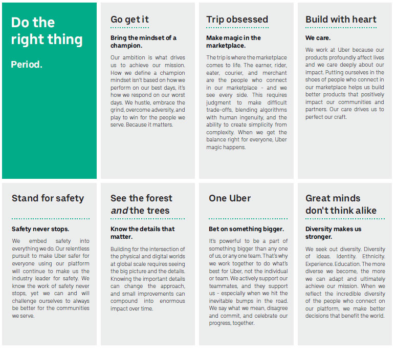 Our values reflect who we are and where we are going. They guide our decision-making, unite and define our culture, and tell a story to the world about Uber’s corporate purpose.