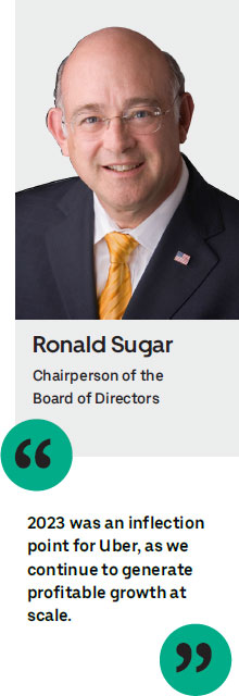 2023 was an inflection point for Uber, as we continue to generate profitable growth at scale. We are using our momentum, and especially our ability to build with heart, to accelerate our growth. Our Board recently authorized the repurchase of $7 billion of the Company’s common stock, a vote of confidence in the Company’s strong financial momentum. Thank you for your investment as an Uber stockholder and your continued support. We look forward to your partnership on this journey together.