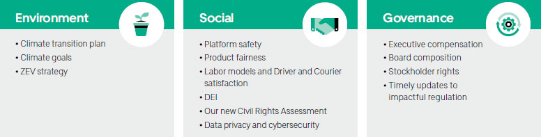 This proxy statement contains forward-looking statements regarding our future business expectations, including our climate change- and sustainability-related goals and related time frames. Actual results may differ materially from the results predicted, and reported results should not be considered as an indication of future performance. Forward-looking statements include all statements that are not historical facts and can be identified by terms such as “anticipate,” “believe,” “contemplate,” “continue,” “could,” “estimate,” “expect,” “hope,” “intend,” “may,” “might,” “objective,” “ongoing,” “plan,” “potential,” “predict,” “project,” “should,” “target,” “will,” or “would” or similar expressions and the negatives of those terms. Forward-looking statements involve known and unknown risks, uncertainties and other factors that may cause our actual results, performance, or achievements to be materially different from any future results, performance, or achievements expressed or implied by the forward-looking statements. These risks, uncertainties, and other factors relate to, among others: investments in new products or offerings, the availability and adoption of zero-emission vehicles and related infrastructure, the development of zero-emission vehicle technology, our ability to partner with cities, transit agencies, and micromobility providers, our financial performance and ability to invest in and provide resources to promote sustainable rides, our ability to attract Drivers, Couriers, consumers, and other partners to our platform, competition, and managing our growth and corporate culture, financial performance, our brand and reputation, other legal and regulatory developments, particularly with respect to our relationships with Drivers and Couriers and the impact of the global economy, including rising inflation and interest rates. For additional information on other potential risks and uncertainties that could cause actual results to differ from the results predicted, please see our Annual Report on Form 10-K for the year ended December 31, 2023, and subsequent quarterly reports and other filings filed with the Securities and Exchange Commission from time to time. All information provided in this proxy statement is as of the date of this proxy statement and any forward-looking statements contained herein are based on assumptions that we believe to be reasonable as of this date. Undue reliance should not be placed on the forward-looking statements in this proxy statements, which are based on information available to us on the date hereof. We undertake no duty to update this information unless required by law.