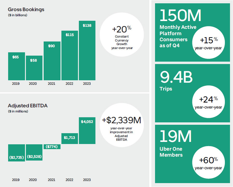 On behalf of our entire Board, we thank you for your continued support of Uber. 2023 was a standout year for Uber, with healthy growth across metrics such as Gross Bookings, Trips, and monthly active platform consumers, achieving record profits while supporting Drivers and Couriers, who earned nearly $62 billion on our platform during the year. We grew our Gross Bookings by 20% to $137.9 billion1 and had $1.9 billion in net income and $4.1 billion in Adjusted EBITDA. We reached our full-year GAAP operating profitability milestone and gained entry into the S&P 500 sooner than anticipated.