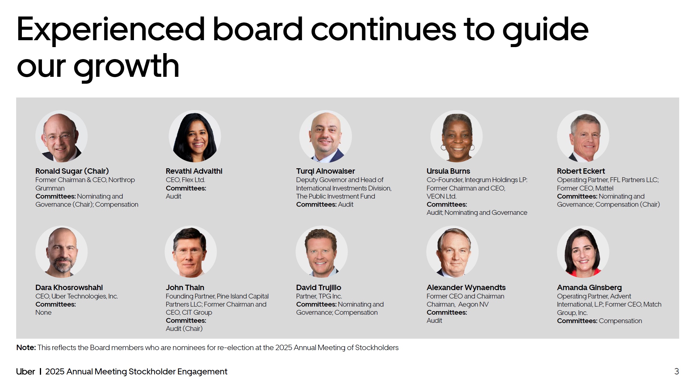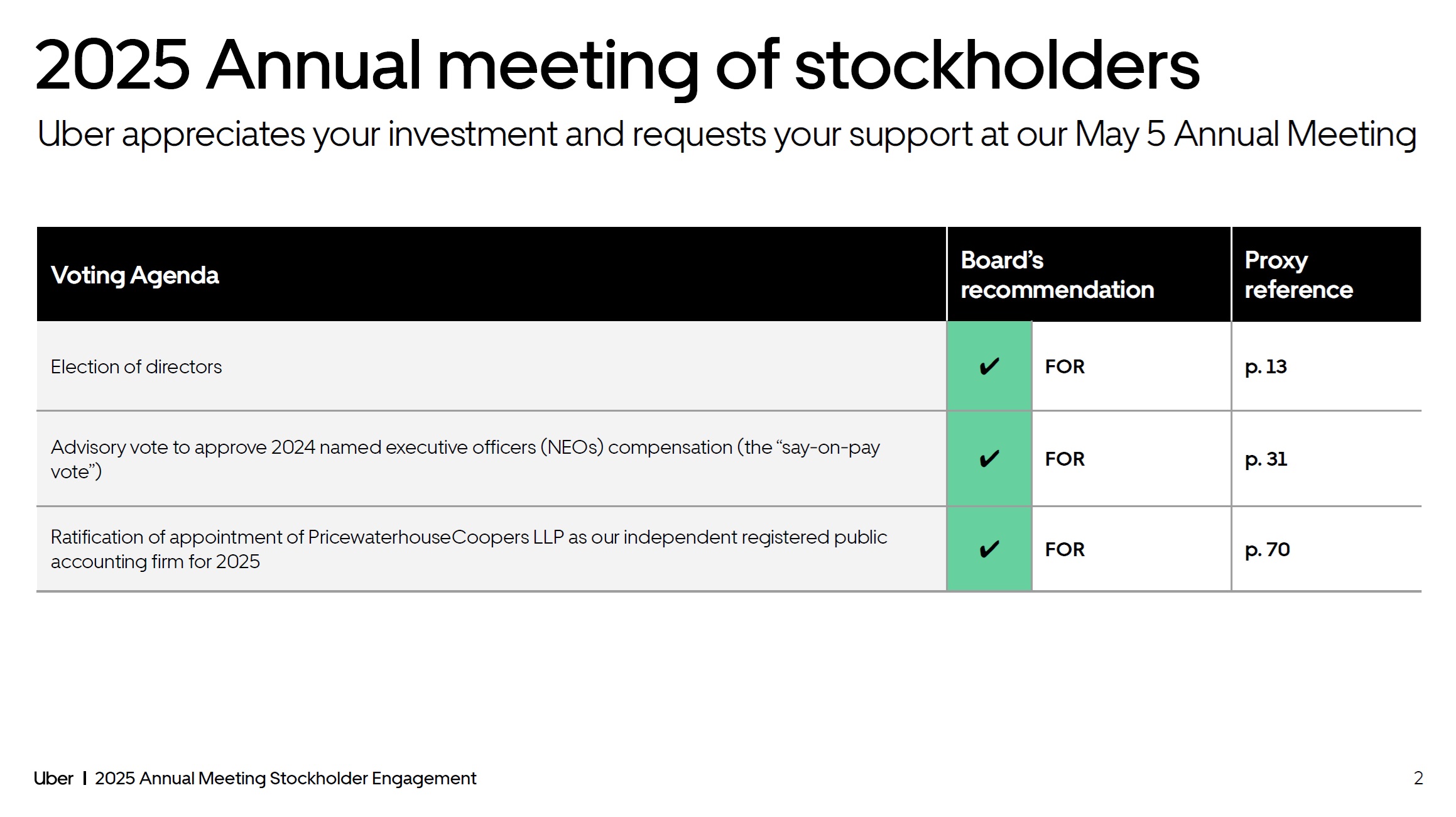 2025 Annual Meeting Stockholder Engagement 2 2025 Annual meeting of stockholders Uber appreciates your investment and requests your support at our May 5 Annual Meeting Voting Agenda Board’s recommendation Proxy reference Election of directors ✔ FOR p. 13 Advisory vote to approve 2024 named executive officers (NEOs) compensation (the “say-on-pay vote”) ✔ FOR p. 31 Ratification of appointment of PricewaterhouseCoopers LLP as our independent registered public accounting firm for 2025 ✔ FOR p. 70