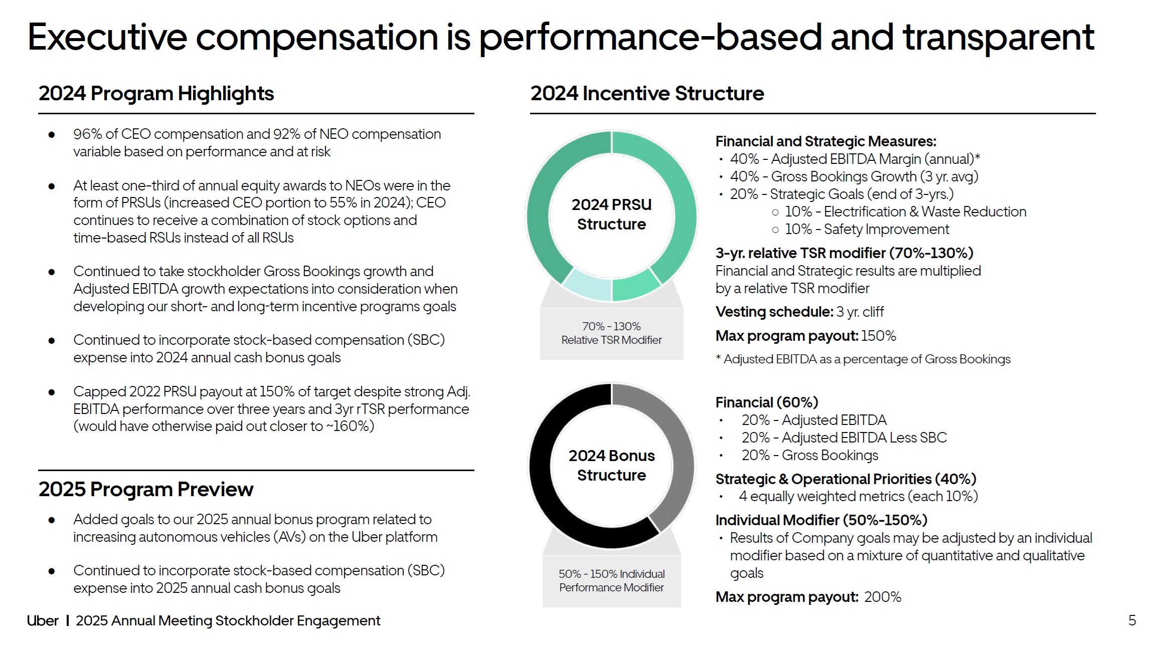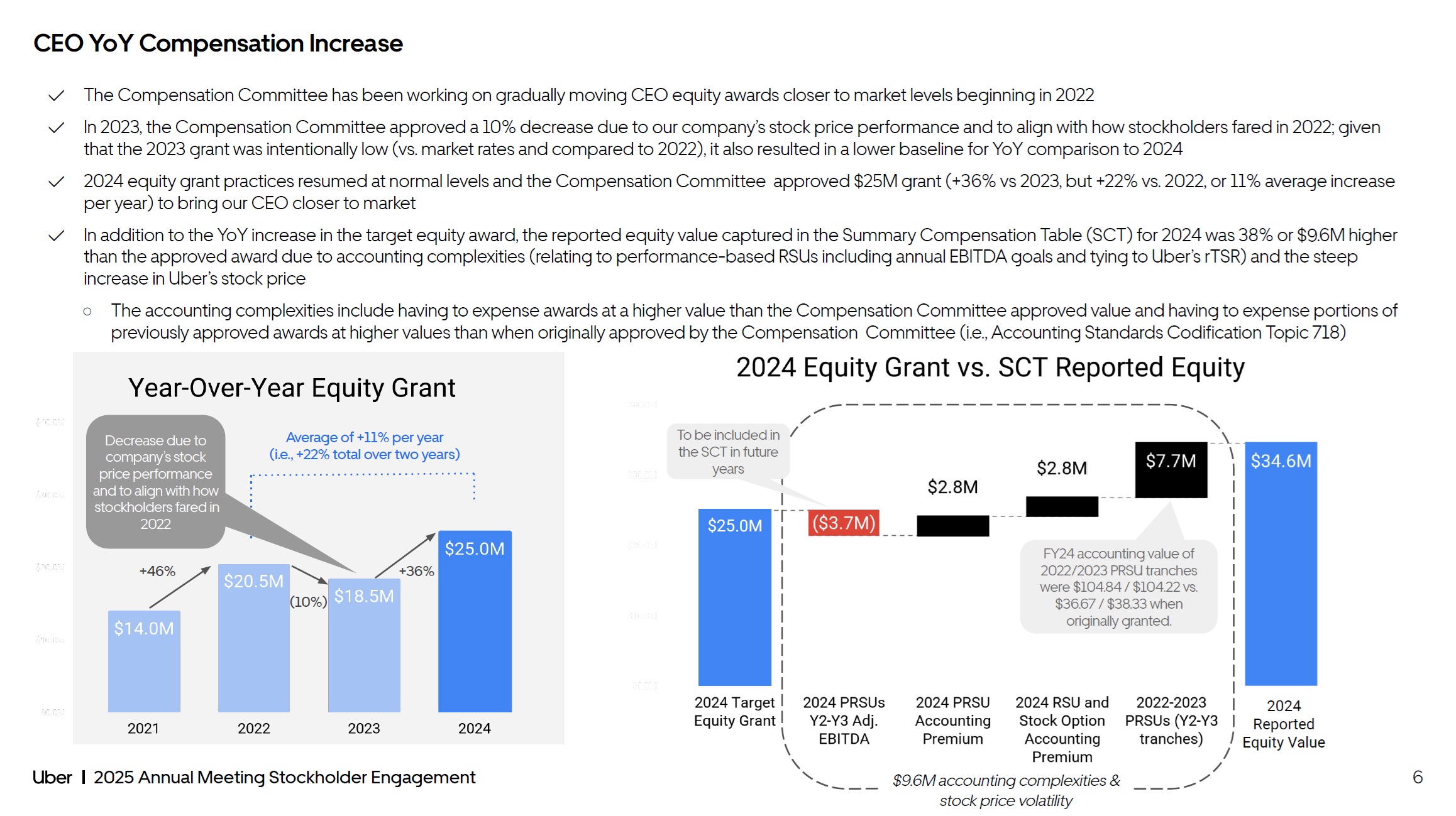 5 Executive compensation is performance-based and transparent 2025 Annual Meeting Stockholder Engagement 2024 Incentive Structure 2024 PRSU Structure 2024 Bonus Structure 70% - 130% Relative TSR Modifier 50% - 150% Individual Performance Modifier 2024 Program Highlights 2025 Program Preview ● Added goals to our 2025 annual bonus program related to increasing autonomous vehicles (AVs) on the Uber platform ● Continued to incorporate stock-based compensation (SBC) expense into 2025 annual cash bonus goals Financial and Strategic Measures: • 40% - Adjusted EBITDA Margin (annual)* • 40% - Gross Bookings Growth (3 yr. avg) • 20% - Strategic Goals (end of 3-yrs.) ○ 10% - Electrification & Waste Reduction ○ 10% - Safety Improvement 3-yr. relative TSR modifier (70%-130%) Financial and Strategic results are multiplied by a relative TSR modifier Vesting schedule: 3 yr. cliff Max program payout: 150% * Adjusted EBITDA as a percentage of Gross Bookings Financial (60%) • 20% - Adjusted EBITDA • 20% - Adjusted EBITDA Less SBC • 20% - Gross Bookings Strategic & Operational Priorities (40%) • 4 equally weighted metrics (each 10%) Individual Modifier (50%-150%) • Results of Company goals may be adjusted by an individual modifier based on a mixture of quantitative and qualitative goals Max program payout: 200% ● 96% of CEO compensation and 92% of NEO compensation variable based on performance and at risk ● At least one-third of annual equity awards to NEOs were in the form of PRSUs (increased CEO portion to 55% in 2024); CEO continues to receive a combination of stock options and time-based RSUs instead of all RSUs ● Continued to take stockholder Gross Bookings growth and Adjusted EBITDA growth expectations into consideration when developing our short- and long‑term incentive programs goals ● Continued to incorporate stock-based compensation (SBC) expense into 2024 annual cash bonus goals ● Capped 2022 PRSU payout at 150% of target despite strong Adj. EBITDA performance over three years and 3yr rTSR performance (would have otherwise paid out closer to ~160%) uber