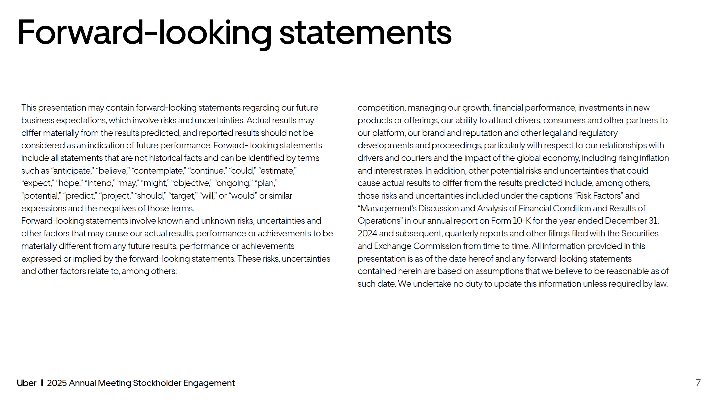 2025 Annual Meeting Stockholder Engagement May 5, 2025 Uber