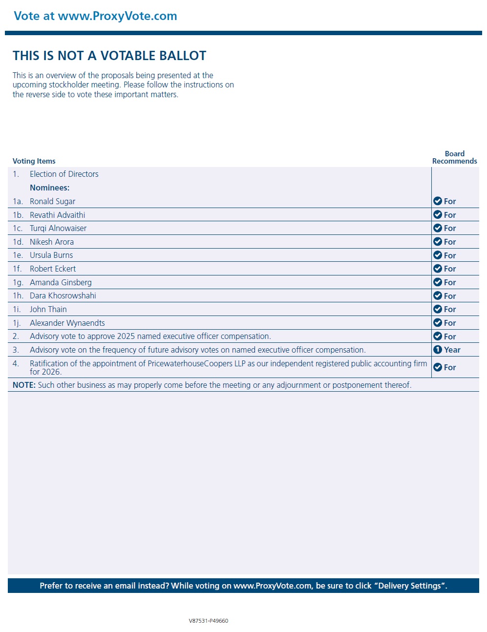 THIS IS NOT A VOTABLE BALLOT This is an overview of the proposals being presented at the upcoming stockholder meeting. Please follow the instructions on the reverse side to vote these important matters. Vote at www.ProxyVote.com Prefer to receive an email instead? While voting on www.ProxyVote.com, be sure to click “Delivery Settings”. Voting Items Board Recommends V87531-P49660 1. Election of Directors Nominees: 1a. Ronald Sugar For 1b. Revathi Advaithi For 1c. Turqi Alnowaiser For 1d. Nikesh Arora For 1e. Ursula Burns For 1f. Robert Eckert For 1g. Amanda Ginsberg For 1h. Dara Khosrowshahi For 1i. John Thain For 1j. Alexander Wynaendts For 2. Advisory vote to approve 2025 named executive officer compensation. For 3. Advisory vote on the frequency of future advisory votes on named executive officer compensation. 1 Year 4. Ratification of the appointment of PricewaterhouseCoopers LLP as our independent registered public accounting firm for 2026. For NOTE: Such other business as may properly come before the meeting or any adjournment or postponement thereof.