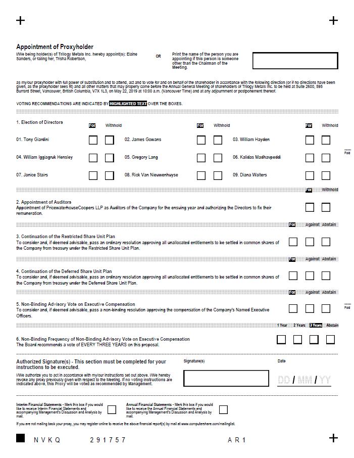 Appointment of Proxy holderI/We being holder(s) of Trilogy Metals Inc. hereby appoint(s): Elaine Sanders, or failing her, Trisha Robertson, OR Print the name of the person you are appointing if this person is someone other than the Chairman of the Meeting. as my/our proxyholder with full power of substitution and to attend, act and to vote for and on behalf of the shareholder in accordance with the following direction (or if no directions have been given, as the proxyholder sees fit) and all other matters that may properly come before the Annual General Meeting of shareholders of Trilogy Metals Inc. to be held at Suite 2600, 595Burrard Street, Vancouver, British Columbia, V7X 1L3, on May 22, 2019 at 10:00 a.m. (Vancouver Time) and at any adjournment or postponement thereof. VOTING RECOMMENDATIONS ARE INDICATED BY HIGHLIGHTED TEXT OVER THE BOXES. 1. Election of Directors For Withhold 01. Tony Giardini 02. James Gowans 03. William Hayden 04. William Iggiagruk Hensley 05. Gregory Lang 06. Kalidas Madhavpeddi 07. Janice Stairs 08. Rick Van Nieuwenhuyse 09. Diana Walters 2. Appointment of Auditors Appointment of PricewaterhouseCoopers LLP as Auditors of the Company for the ensuing year and authorizing the Directors to fix the irremuneration. For Against Abstain 3. Continuation of the Restricted Share Unit Plan To consider and, if deemed advisable, pass an ordinary resolution approving all unallocated entitlements to be settled in common shares of the Company from treasury under the Restricted Share Unit Plan. 4. Continuation of the Deferred Share Unit Plan To consider and, if deemed advisable, pass an ordinary resolution approving all unallocated entitlements to be settled in common shares of the Company from treasury under the Deferred Share Unit Plan. 5. Non-Binding Advisory Vote on Executive Compensation To consider and, if deemed advisable, pass a non-binding resolution approving the compensation of the Company's Named Executive Officers. 6. Non-Binding Frequency of Non-Binding Advisory Vote on Executive Compensation The Board recommends a vote of EVERY THREE YEARS on this proposal. Authorized Signature(s) - This section must be completed for your instructions to be executed. I/We authorize you to act in accordance with my/our instructions set out above. I/We hereby revoke any proxy previously given with respect to the Meeting. If no voting instructions are indicated above, this Proxy will be voted as recommended by Management. Signature(s) Date Interim Financial Statements - Mark this box if you would like to receive Interim Financial Statements and accompanying Management’s Discussion and Analysis by mail. Annual Financial Statements - Mark this box if you would like to receive the Annual Financial Statements and accompanying Management’s Discussion and Analysis by mail. If you are not mailing back your proxy, you may register online to receive the above financial report(s) by mail at www.computershare.com/mailinglist. N V K Q 2 9 1 7 5 7 A R 1