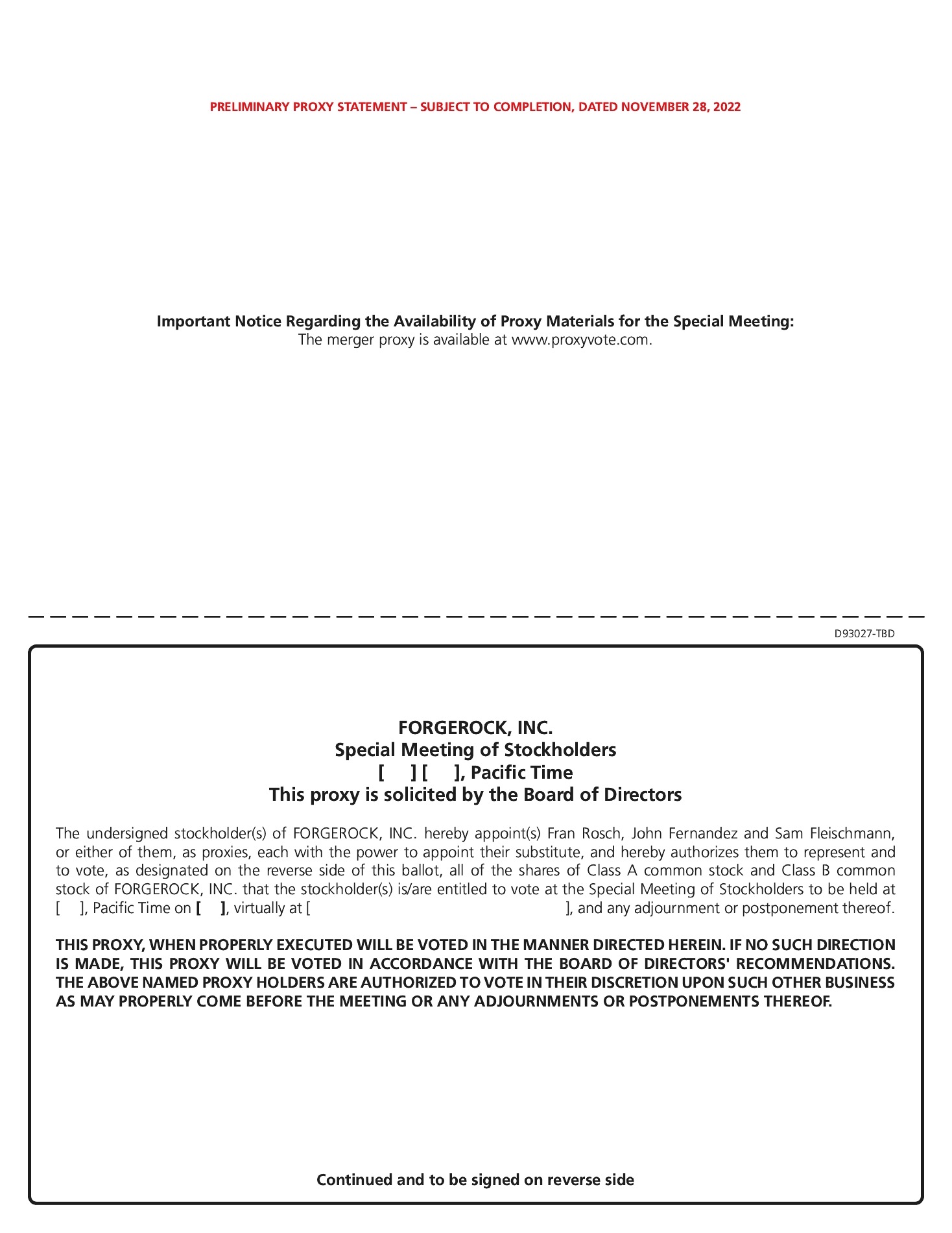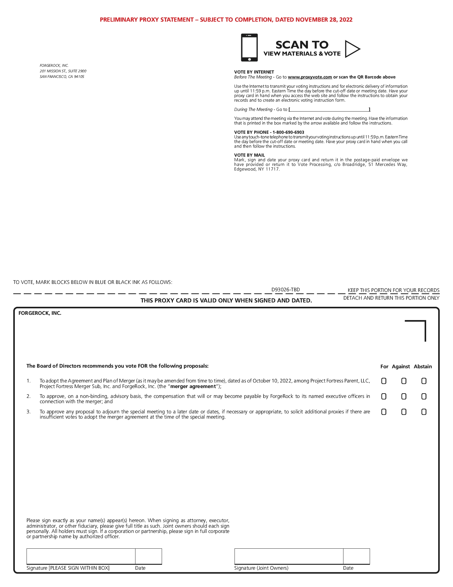 Except as otherwise specifically noted in this proxy statement, “ForgeRock,” “we,” “our,” “us and similar words refer to ForgeRock, Inc., including, in certain cases, our subsidiaries. Throughout this proxy statement, the “ForgeRock Board refers to ForgeRock’s Board of Directors. Throughout this proxy statement, we refer to Project Fortress Parent, LLC, as “Parent,” and Project Fortress Merger Sub, Inc., as “Merger Sub.” In addition, throughout this proxy statement we refer to the Agreement and Plan of Merger (as it may be amended from time to time), dated October 10, 2022, between Parent, Merger Sub and ForgeRock as the “merger agreement.”