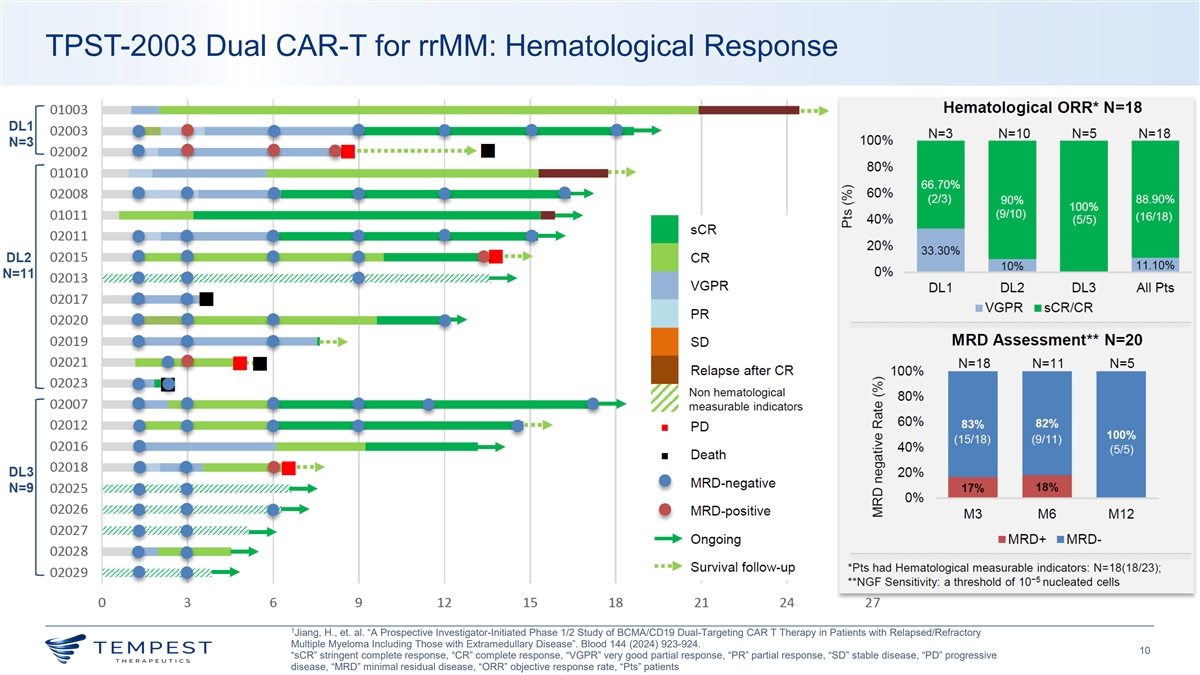 TPST-2003 Dual CAR-T for rrMM: Hematological Response 1 Jiang, H., et. al. “A Prospective Investigator-Initiated Phase 1/2 Study of BCMA/CD19 Dual-Targeting CAR T Therapy in Patients with Relapsed/Refractory Multiple Myeloma Including Those with Extramedullary Disease”. Blood 144 (2024) 923-924. 10 “sCR” stringent complete response, “CR” complete response, “VGPR” very good partial response, “PR” partial response, “SD” stable disease, “PD” progressive disease, “MRD” minimal residual disease, “ORR” objective response rate, “Pts” patients