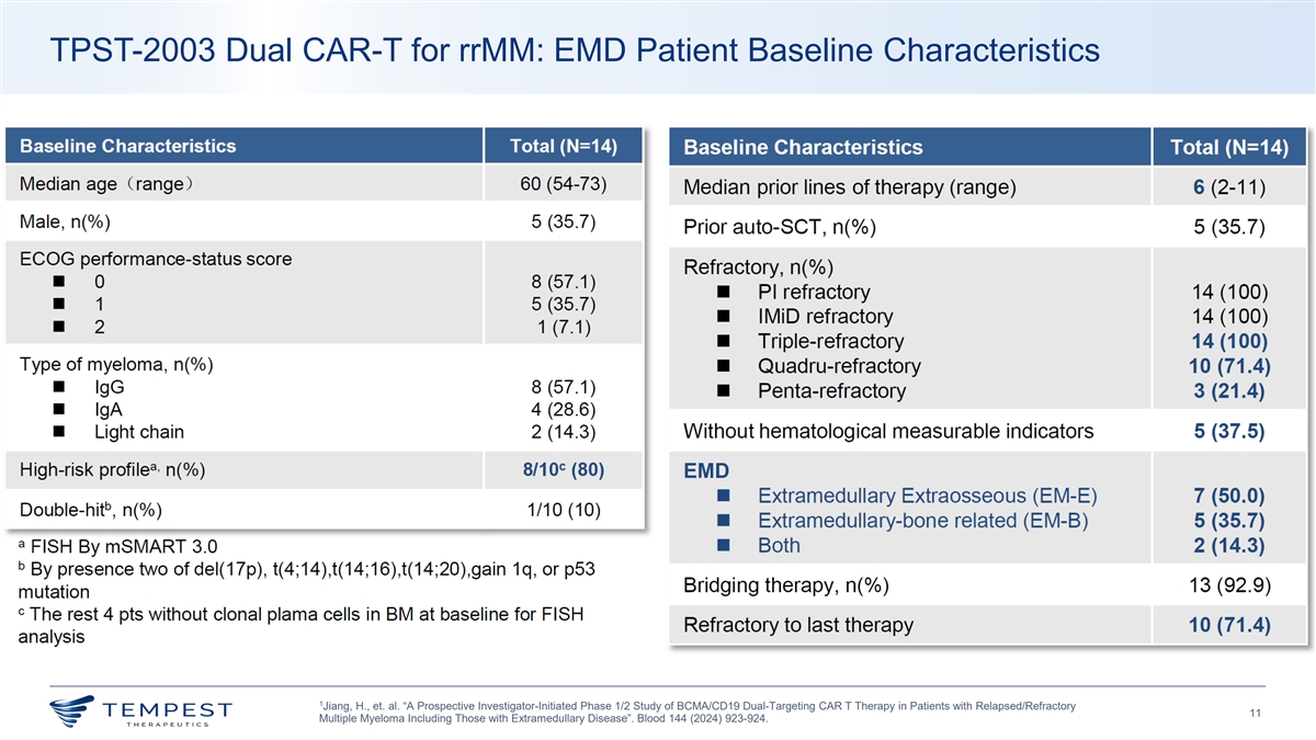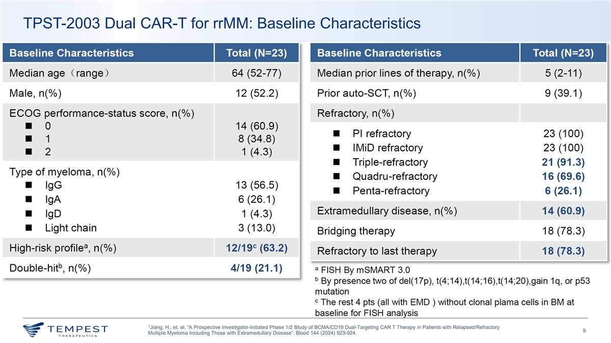 TPST-2003 Dual CAR-T for rrMM: Baseline Characteristics 1 Jiang, H., et. al. “A Prospective Investigator-Initiated Phase 1/2 Study of BCMA/CD19 Dual-Targeting CAR T Therapy in Patients with Relapsed/Refractory 9 Multiple Myeloma Including Those with Extramedullary Disease”. Blood 144 (2024) 923-924.
