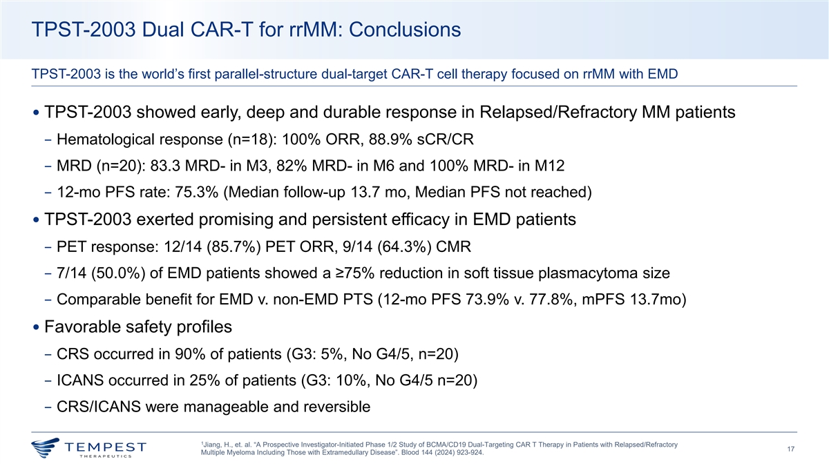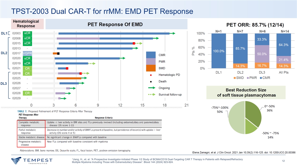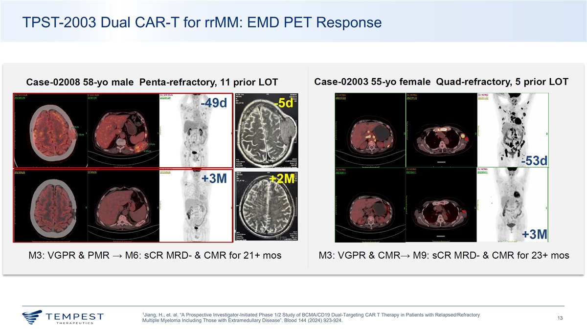 TPST-2003 Dual CAR-T for rrMM: EMD PET Response 1 Jiang, H., et. al. “A Prospective Investigator-Initiated Phase 1/2 Study of BCMA/CD19 Dual-Targeting CAR T Therapy in Patients with Relapsed/Refractory 13 Multiple Myeloma Including Those with Extramedullary Disease”. Blood 144 (2024) 923-924.