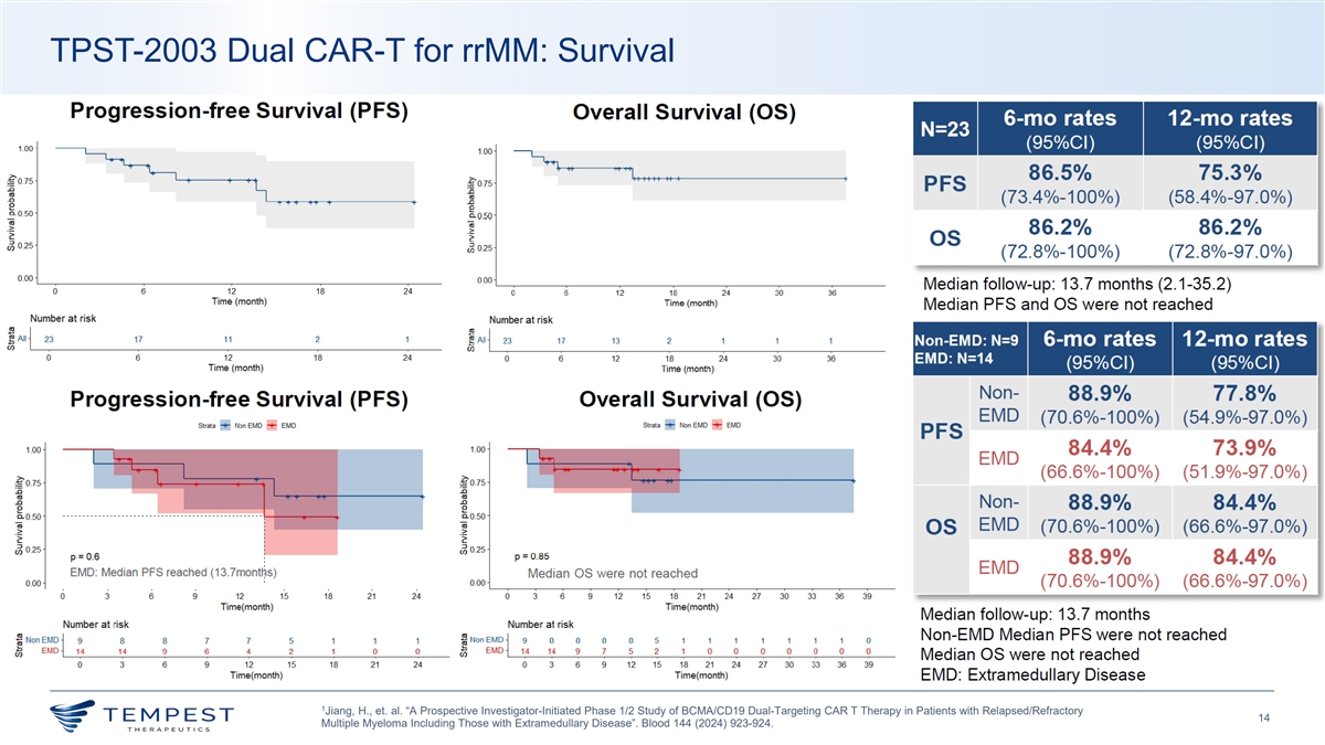 TPST-2003 Dual CAR-T for rrMM: Survival 1 Jiang, H., et. al. “A Prospective Investigator-Initiated Phase 1/2 Study of BCMA/CD19 Dual-Targeting CAR T Therapy in Patients with Relapsed/Refractory 14 Multiple Myeloma Including Those with Extramedullary Disease”. Blood 144 (2024) 923-924.