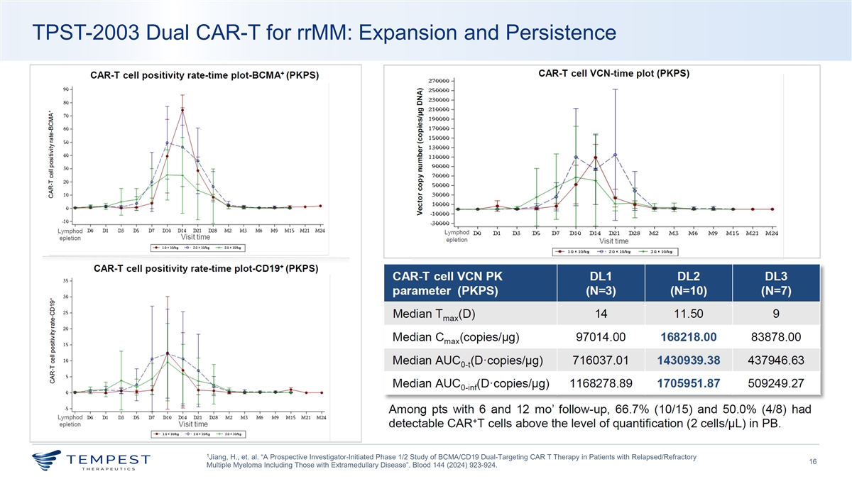 TPST-2003 Dual CAR-T for rrMM: Expansion and Persistence 1 Jiang, H., et. al. “A Prospective Investigator-Initiated Phase 1/2 Study of BCMA/CD19 Dual-Targeting CAR T Therapy in Patients with Relapsed/Refractory 16 Multiple Myeloma Including Those with Extramedullary Disease”. Blood 144 (2024) 923-924.