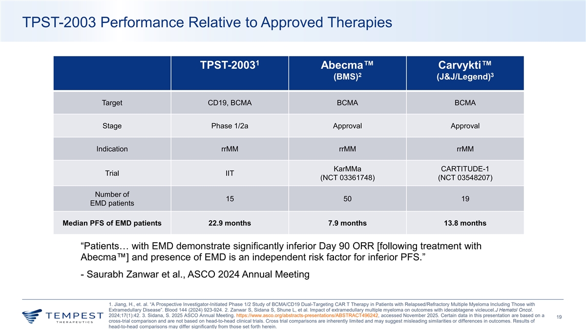 TPST-2003 Shows Similar Favorable Safety Profile to Approved BCMA CAR-T Abecma Carvykti 1 TPST-2003 2 3 (BMS) (J&J/Legend) Target CD19, BCMA BCMA BCMA Stage IIT Approval Approval Indication rrMM rrMM rrMM 6 6 6 6 6 Target Dose 1x10 cells/kg 2x10 cells/kg 3x10 cells/kg 420x10 cells 0.75x10 cells/kg CRS% (N) 66.7% (2) 100% (11) 88.9% (8) 85% 84% CRS% Gr≥3 (N) 0% 9.1% (1) 0% 9.3% 4% ICANS% (N) 33.3% (1) 27.3% (3) 11.1% (1) 28% 13% ICANS% Gr ≥3 (N) 0% 9.1% (1) 0% 4% 2% CRS and ICANS were manageable and reversible, showing a favorable safety profile comparable to existing therapies 1. Jiang, H., et. al. “A Prospective Investigator-Initiated Phase 1/2 Study of BCMA/CD19 Dual-Targeting CAR T Therapy in Patients with Relapsed/Refractory Multiple Myeloma Including Those with Extramedullary Disease”. Blood 144 (2024) 923-924. 2. Abecmatm label at https://www.abecmahcp.com/safety/crs, accessed Nov 2025. 3. CarvyktiTM label at https://www.carvyktihcp.com/carvykti- 18 safety/, accessed November 2025. Certain data in this presentation are based on a cross-trial comparison and are not based on head-to-head clinical trials. Cross trial comparisons are inherently limited and may suggest misleading similarities or differences in outcomes. Results of head-to-head comparisons may differ significantly from those set forth herein.