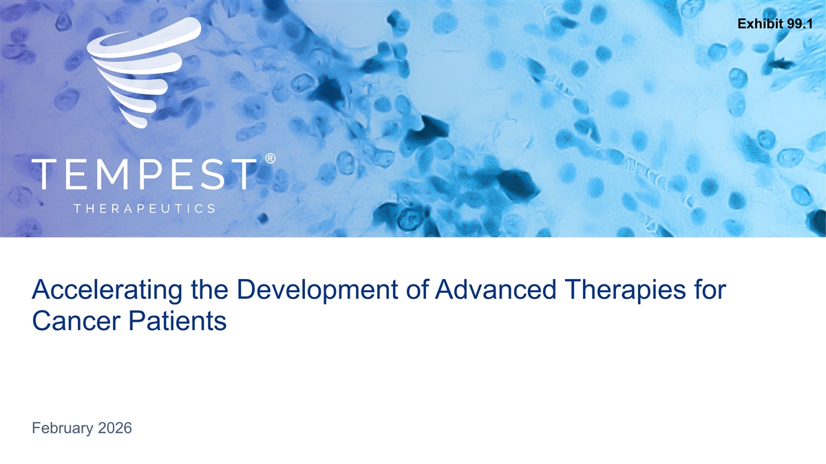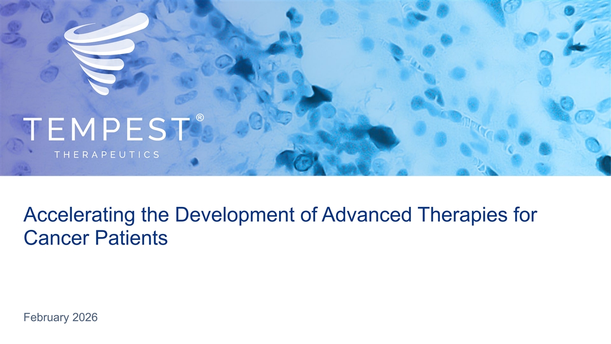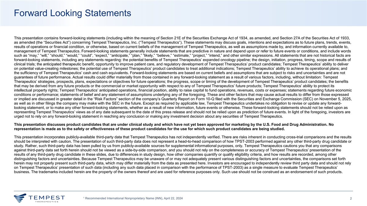 Forward Looking Statements This presentation contains forward-looking statements (including within the meaning of Section 21E of the Securities Exchange Act of 1934, as amended, and Section 27A of the Securities Act of 1933, as amended (the “Securities Act”) concerning Tempest Therapeutics, Inc. (“Tempest Therapeutics”). These statements may discuss goals, intentions and expectations as to future plans, trends, events, results of operations or financial condition, or otherwise, based on current beliefs of the management of Tempest Therapeutics, as well as assumptions made by, and information currently available to, management of Tempest Therapeutics. Forward-looking statements generally include statements that are predictive in nature and depend upon or refer to future events or conditions, and include words such as “may,” “will,” “should,” “would,” “could”, “expect,” “anticipate,” “plan,” “likely,” “believe,” “estimate,” “project,” “intend,” and other similar expressions. All statements that are not historical facts are forward-looking statements, including any statements regarding: the potential benefits of Tempest Therapeutics’ expanded oncology pipeline; the design, initiation, progress, timing, scope and results of clinical trials; the anticipated therapeutic benefit, opportunity to improve patient care, and regulatory development of Tempest Therapeutics’ product candidates; Tempest Therapeutics’ ability to deliver on potential value-creating milestones; the potential use of Tempest Therapeutics’ product candidates to treat additional indications; Tempest Therapeutics’ ability to achieve its operational plans; and the sufficiency of Tempest Therapeutics’ cash and cash equivalents. Forward-looking statements are based on current beliefs and assumptions that are subject to risks and uncertainties and are not guarantees of future performance. Actual results could differ materially from those contained in any forward-looking statement as a result of various factors, including, without limitation: Tempest Therapeutics’ strategies, prospects, plans, expectations or objectives for future operations; the progress, scope or timing of the development of Tempest Therapeutics’ product candidates; the benefits that may be derived from any future products or the commercial or market opportunity with respect to any of Tempest Therapeutics’ future products; Tempest Therapeutics’ ability to protect its intellectual property rights; Tempest Therapeutics’ anticipated operations, financial position, ability to raise capital to fund operations, revenues, costs or expenses; statements regarding future economic conditions or performance; statements of belief and any statement of assumptions underlying any of the foregoing. These and other factors that may cause actual results to differ from those expressed or implied are discussed in greater detail in the “Risk Factors” section of the company’s Quarterly Report on Form 10-Q filed with the Securities and Exchange Commission (SEC) on November 5, 2025, as well as in other filings the company may make with the SEC in the future. Except as required by applicable law, Tempest Therapeutics undertakes no obligation to revise or update any forward- looking statement, or to make any other forward-looking statements, whether as a result of new information, future events or otherwise. These forward-looking statements should not be relied upon as representing Tempest Therapeutics’ views as of any date subsequent to the date of this press release and should not be relied upon as prediction of future events. In light of the foregoing, investors are urged not to rely on any forward-looking statement in reaching any conclusion or making any investment decision about any securities of Tempest Therapeutics. This presentation discusses product candidates that are under clinical study and which have not yet been approved for marketing by the U.S. Food and Drug Administration. No representation is made as to the safety or effectiveness of these product candidates for the use for which such product candidates are being studied. This presentation incorporates publicly-available third-party data that Tempest Therapeutics has not independently verified. There are risks inherent in conducting cross-trial comparisons and the results should be interpreted with caution. The presentation of such third-party data does not represent a head-to-head comparison of how TPST-2003 performed against any other third-party drug candidate or study. Rather, such third-party data has been pulled by us from publicly-available sources for supplemental informational purposes, only. Tempest Therapeutics cautions you that any comparisons against third-party data set forth herein should not be viewed as a side-by-side comparison, and you should not rely on the completeness or accuracy of Tempest Therapeutics’ presentation of the results of any third-party drug candidate in these slides, due to differences in study design, how other companies quantify or qualify eligibility criteria, and how results are recorded, among other distinguishing factors and uncertainties. Because Tempest Therapeutics may be unaware of or may not adequately present various distinguishing factors and uncertainties, the comparisons set forth herein may not properly present such third-party data, which may differ materially from the data as presented here. Investors are encouraged to independently review third party data and should not rely on Tempest Therapeutics’ presentation of such data (including any such data placed in comparison with the performance of TPST-2003) as a single measure to evaluate Tempest Therapeutics’ business. The trademarks included herein are the property of the owners thereof and are used for reference purposes only. Such use should not be construed as an endorsement of such products. 1 Recommended International 