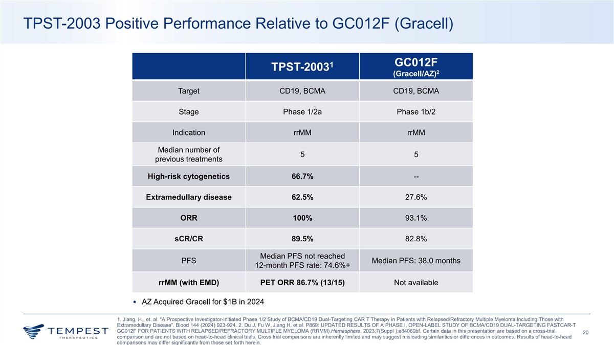 TPST-2003 Performance Relative to Approved Therapies 1 TPST-2003 Abecma Carvykti 2 3 (BMS) (J&J/Legend) Target CD19, BCMA BCMA BCMA Stage Phase 1/2a Approval Approval Indication rrMM rrMM rrMM KarMMa CARTITUDE-1 Trial IIT (NCT 03361748) (NCT 03548207) Number of 15 50 19 EMD patients Median PFS of EMD patients 22.9 months 7.9 months 13.8 months “Patients… with EMD demonstrate significantly inferior Day 90 ORR [following treatment with Abecma ] and presence of EMD is an independent risk factor for inferior PFS.” - Saurabh Zanwar et al., ASCO 2024 Annual Meeting 1. Jiang, H., et. al. “A Prospective Investigator-Initiated Phase 1/2 Study of BCMA/CD19 Dual-Targeting CAR T Therapy in Patients with Relapsed/Refractory Multiple Myeloma Including Those with Extramedullary Disease”. Blood 144 (2024) 923-924. 2. Zanwar S, Sidana S, Shune L, et al. Impact of extramedullary multiple myeloma on outcomes with idecabtagene vicleucel.J Hematol Oncol. 2024;17(1):42. 3. Sidana, S. 2025 ASCO Annual Meeting. https://www.asco.org/abstracts-presentations/ABSTRACT496242, accessed November 2025. Certain data in this presentation are based on a 19 cross-trial comparison and are not based on head-to-head clinical trials. Cross trial comparisons are inherently limited and may suggest misleading similarities or differences in outcomes. Results of head-to-head comparisons may differ significantly from those set forth herein.