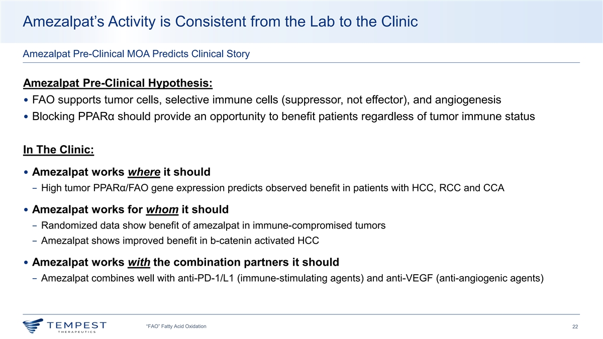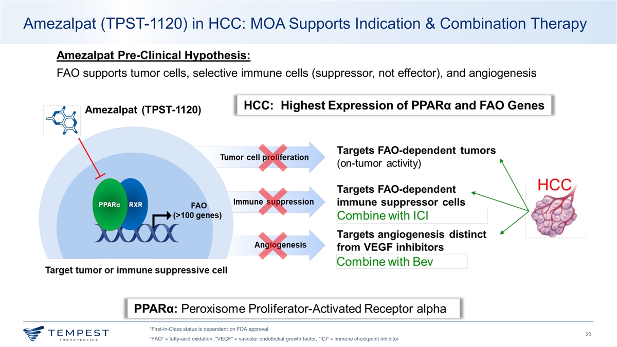 Amezalpat’s Activity is Consistent from the Lab to the Clinic Amezalpat Pre-Clinical MOA Predicts Clinical Story Amezalpat Pre-Clinical Hypothesis: • FAO supports tumor cells, selective immune cells (suppressor, not effector), and angiogenesis • Blocking PPARα should provide an opportunity to benefit patients regardless of tumor immune status In The Clinic: • Amezalpat works where it should − High tumor PPARα/FAO gene expression predicts observed benefit in patients with HCC, RCC and CCA • Amezalpat works for whom it should − Randomized data show benefit of amezalpat in immune-compromised tumors − Amezalpat shows improved benefit in b-catenin activated HCC • Amezalpat works with the combination partners it should − Amezalpat combines well with anti-PD-1/L1 (immune-stimulating agents) and anti-VEGF (anti-angiogenic agents) “FAO” Fatty Acid Oxidation 22