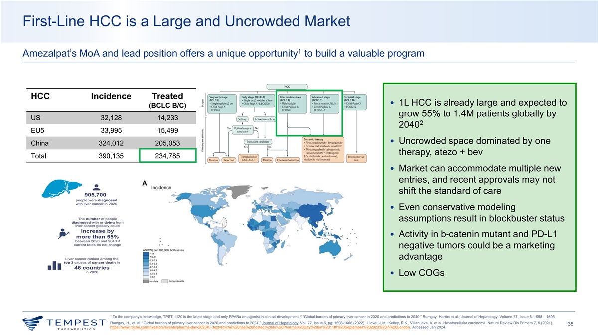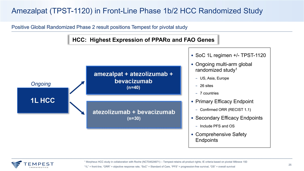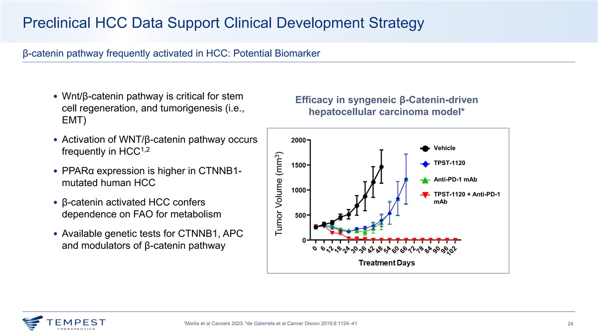 Amezalpat (TPST-1120) in HCC: MOA Supports Indication & Combination Therapy Amezalpat Pre-Clinical Hypothesis: FAO supports tumor cells, selective immune cells (suppressor, not effector), and angiogenesis 1 First-in-Class status is dependent on FDA approval 23 “FAO” = fatty-acid oxidation, “VEGF” = vascular endothelial growth factor, “ICI” = immune checkpoint inhibitor