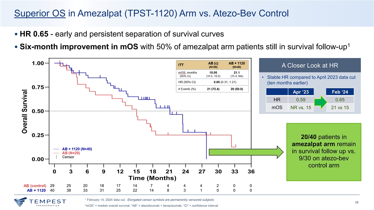 Amezalpat (TPST-1120) Arm Improves All Efficacy Endpoints vs. SoC Control Primary Global Regulatory atezo/bev TPST-1120 + atezo/bev Endpoint N=30 N=40 OS HR 0.65 15m 21m Consistent PFS HR 0.8 Median 4.27m (2.8, 7.3) 7m (5.6, 13.8) Improvement Across Confirmed ORR (ITT population) 13.3% 30% All PD-L1 negative Confirmed ORR 7% 27% Endpoints 1 β-catenin mutation Confirmed ORR N/A 43% (100% DCR) • Biomarkers and pharmacodynamic data support MOA of amezalpat − Consistent with mechanism, amezalpat improves activity of atezo+bev in PD-L1 negative and immune desert/excluded phenotype compared to atezo+bev alone − β-catenin activation and FAO upregulation improve activity in amezalpat arm • Manageable safety profile - no new signal 1 February 14, 2024 data update; Data not provided by Roche. 27 ”HR” = Hazard Ratio