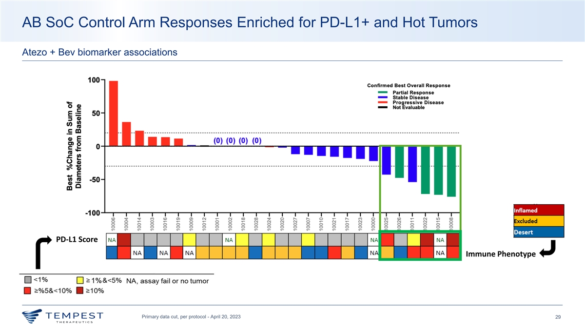 AB SoC Control Arm Responses Enriched for PD-L1+ and Hot Tumors Atezo + Bev biomarker associations PD-L1 Score Immune Phenotype Primary data cut, per protocol - April 20, 2023 29