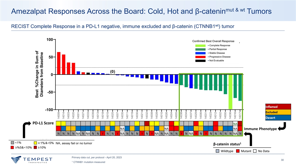 mut & wt Amezalpat Responses Across the Board: Cold, Hot and β-catenin Tumors wt RECIST Complete Response in a PD-L1 negative, immune excluded and β-catenin (CTNNB1 ) tumor 100 Confirmed Best Overall Response Partial Response Stable Disease Progressive Disease Not Evaluable 50 (0) 0 -50 -100 PD-L1 Score Immune Phenotype 1 β-catenin status Wildtype Mutant No Data Primary data cut, per protocol - April 20, 2023 30 1 CTNNB1 mutation measured Best %Change in Sum of Diameters from Baseline 14009 14014 14003 14020 14001 14027 14033 14039 14013 14018 14015 14025 14007 14035 14011 14019 14030 14021 14032 14008 14028 14010 14026 14004 14005 14038 14034 14037 14029 14006 14031 14023 14012 14002 14000 14036 14016 14017