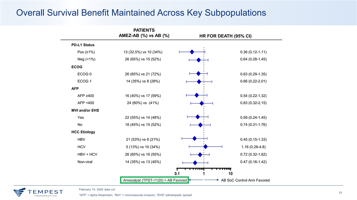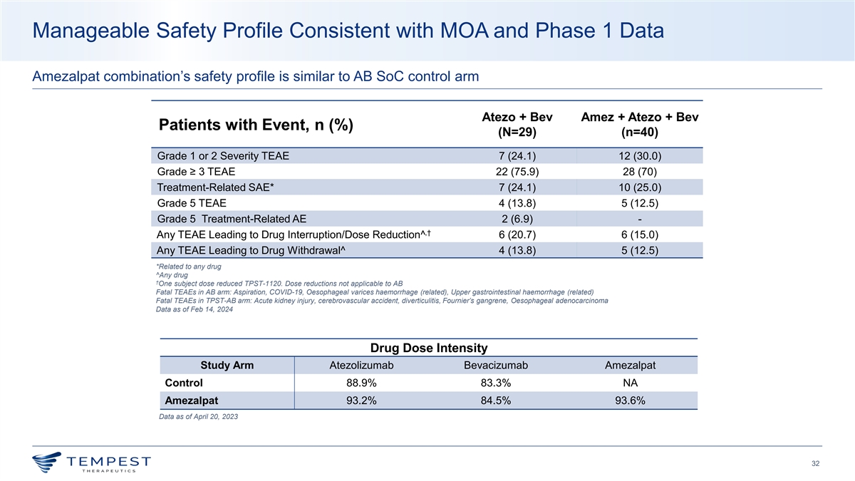 Overall Survival Benefit Maintained Across Key Subpopulations PATIENTS AMEZ-AB (%) vs AB (%) HR FOR DEATH (95% CI) PD-L1 Status Pos (≥1%) 13 (32.5%) vs 10 (34%) 0.36 (0.12-1.11) Neg (<1%) 26 (65%) vs 15 (52%) 0.64 (0.28-1.45) ECOG ECOG 0 26 (65%) vs 21 (72%) 0.63 (0.29-1.35) ECOG 1 14 (35%) vs 8 (28%) 0.66 (0.22-2.01) AFP AFP ≥400 16 (40%) vs 17 (59%) 0.54 (0.22-1.32) AFP <400 24 (60%) vs (41%) 0.83 (0.32-2.15) MVI and/or EHS Yes 22 (55%) vs 14 (48%) 0.59 (0.24-1.45) No 18 (45%) vs 15 (52%) 0.74 (0.31-1.76) HCC Etiology HBV 21 (53%) vs 6 (21%) 0.45 (0.15-1.33) HCV 5 (13%) vs 10 (34%) 1.16 (0.28-4.8) HBV + HCV 26 (65%) vs 16 (55%) 0.72 (0.32-1.62) Non-viral 14 (35%) vs 13 (45%) 0.47 (0.16-1.42) 0.1 1 10 Amezalpat (TPST-1120) + AB Favored AB SoC Control Arm Favored February 14, 2024 data cut 31 “AFP” = alpha fetoprotein, “MVI” = microvascular invasion, “EHS” extrahepatic spread