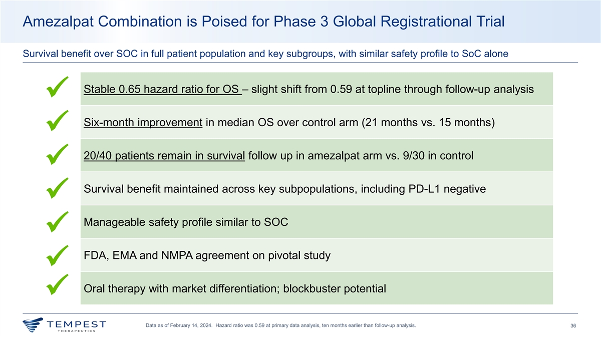 Amezalpat Combination is Poised for Phase 3 Global Registrational Trial Survival benefit over SOC in full patient population and key subgroups, with similar safety profile to SoC alone Stable 0.65 hazard ratio for OS – slight shift from 0.59 at topline through follow-up analysis ü Six-month improvement in median OS over control arm (21 months vs. 15 months) ü 20/40 patients remain in survival follow up in amezalpat arm vs. 9/30 in control ü Survival benefit maintained across key subpopulations, including PD-L1 negative ü Manageable safety profile similar to SOC ü FDA, EMA and NMPA agreement on pivotal study ü Oral therapy with market differentiation; blockbuster potential ü Data as of February 14, 2024. Hazard ratio was 0.59 at primary data analysis, ten months earlier than follow-up analysis. 36
