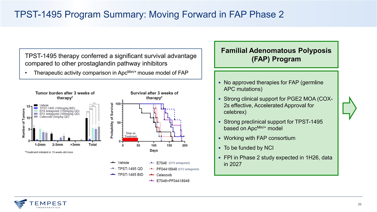 TPST-1495 Program Summary: Moving Forward in FAP Phase 2 Familial Adenomatous Polyposis TPST-1495 therapy conferred a significant survival advantage (FAP) Program compared to other prostaglandin pathway inhibitors Min/+ • Therapeutic activity comparison in Apc mouse model of FAP • No approved therapies for FAP (germline APC mutations) • Strong clinical support for PGE2 MOA (COX- 2s effective, Accelerated Approval for celebrex) • Strong preclinical support for TPST-1495 Min/+ based on Apc model • Working with FAP consortium • To be funded by NCI • FPI in Phase 2 study expected in 1H26, data in 2027 39