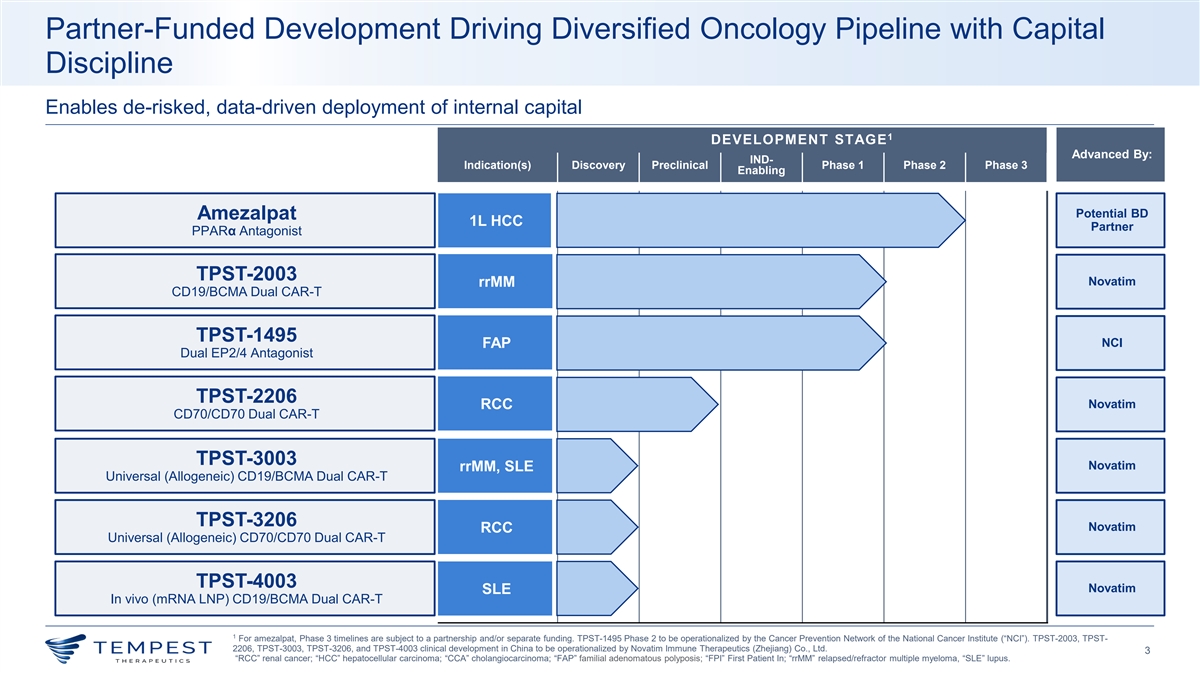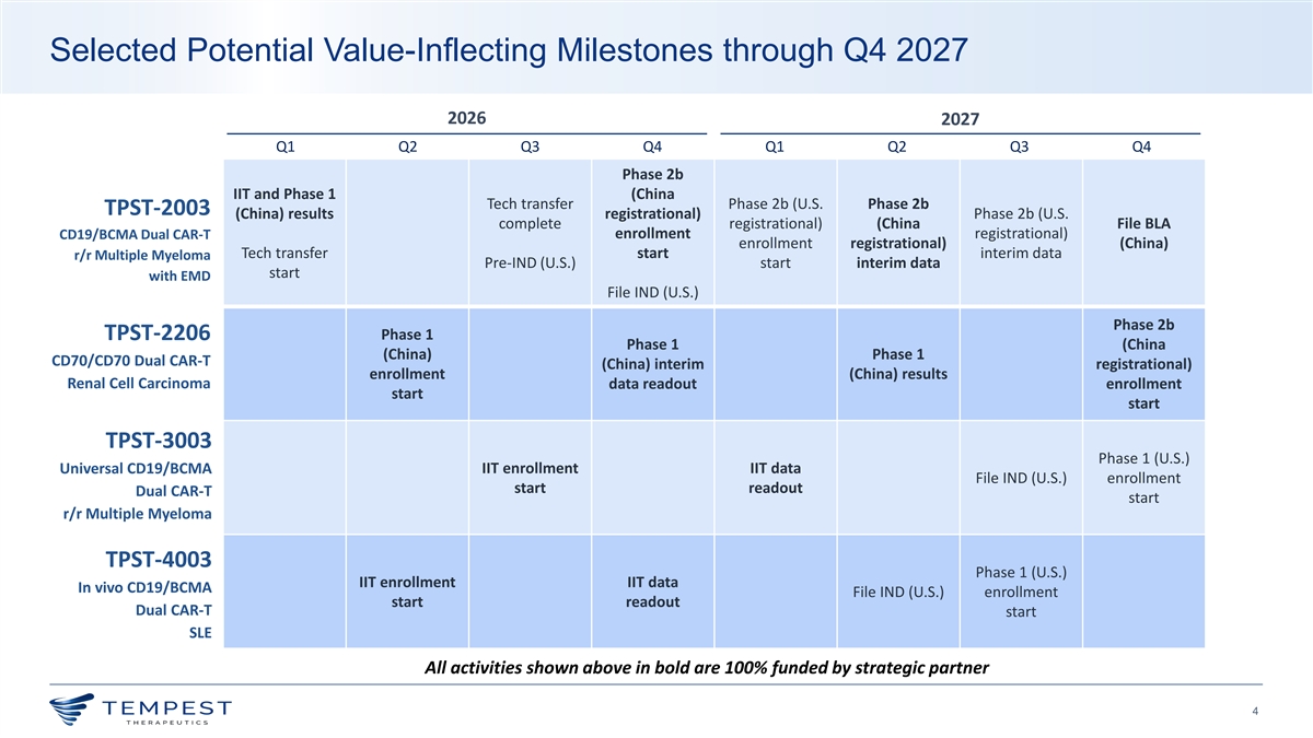 Partner-Funded Development Driving Diversified Oncology Pipeline with Capital Discipline Enables de-risked, data-driven deployment of internal capital 1 DEVELOPMENT STAGE Advanced By: IND- Indication(s) Discovery Preclinical Phase 1 Phase 2 Phase 3 Enabling Potential BD Amezalpat 1L HCC Partner PPARα Antagonist TPST-2003 Novatim rrMM CD19/BCMA Dual CAR-T TPST-1495 NCI FAP Dual EP2/4 Antagonist TPST-2206 RCC Novatim CD70/CD70 Dual CAR-T TPST-3003 Novatim rrMM, SLE Universal (Allogeneic) CD19/BCMA Dual CAR-T TPST-3206 Novatim RCC Universal (Allogeneic) CD70/CD70 Dual CAR-T TPST-4003 Novatim SLE In vivo (mRNA LNP) CD19/BCMA Dual CAR-T 1 For amezalpat, Phase 3 timelines are subject to a partnership and/or separate funding. TPST-1495 Phase 2 to be operationalized by the Cancer Prevention Network of the National Cancer Institute (“NCI”). TPST-2003, TPST- 2206, TPST-3003, TPST-3206, and TPST-4003 clinical development in China to be operationalized by Novatim Immune Therapeutics (Zhejiang) Co., Ltd. 3 “RCC” renal cancer; “HCC” hepatocellular carcinoma; “CCA” cholangiocarcinoma; “FAP” familial adenomatous polyposis; “FPI” First Patient In; “rrMM” relapsed/refractor multiple myeloma, “SLE” lupus.