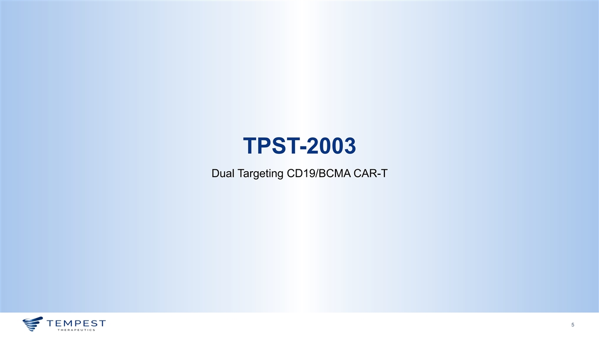 Selected Potential Value-Inflecting Milestones through Q4 2027 2026 2027 Q1 Q2 Q3 Q4 Q1 Q2 Q3 Q4 Phase 2b IIT and Phase 1 (China Tech transfer Phase 2b (U.S. Phase 2b TPST-2003 (China) results registrational) Phase 2b (U.S. complete registrational) (China File BLA CD19/BCMA Dual CAR-T enrollment registrational) enrollment registrational) (China) Tech transfer start interim data r/r Multiple Myeloma Pre-IND (U.S.) start interim data start with EMD File IND (U.S.) Phase 2b TPST-2206 Phase 1 Phase 1 (China (China) Phase 1 CD70/CD70 Dual CAR-T (China) interim registrational) enrollment (China) results Renal Cell Carcinoma data readout enrollment start start TPST-3003 Phase 1 (U.S.) IIT enrollment IIT data Universal CD19/BCMA File IND (U.S.) enrollment start readout Dual CAR-T start r/r Multiple Myeloma TPST-4003 Phase 1 (U.S.) IIT enrollment IIT data In vivo CD19/BCMA File IND (U.S.) enrollment start readout Dual CAR-T start SLE All activities shown above in bold are 100% funded by strategic partner 4