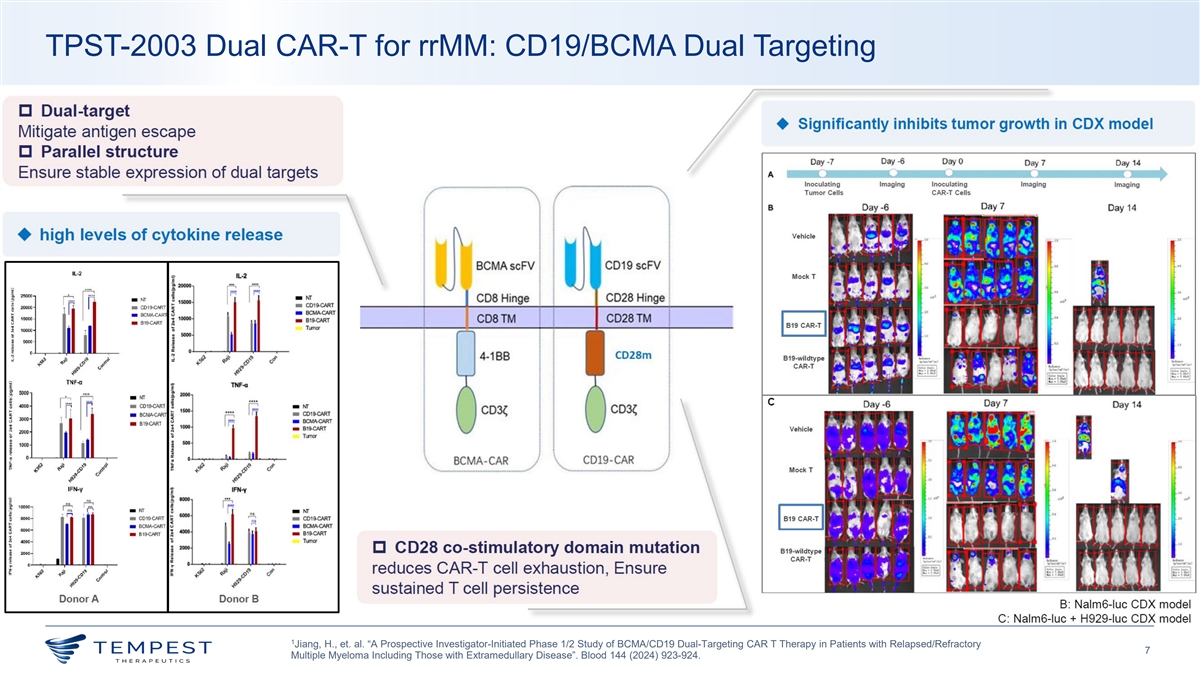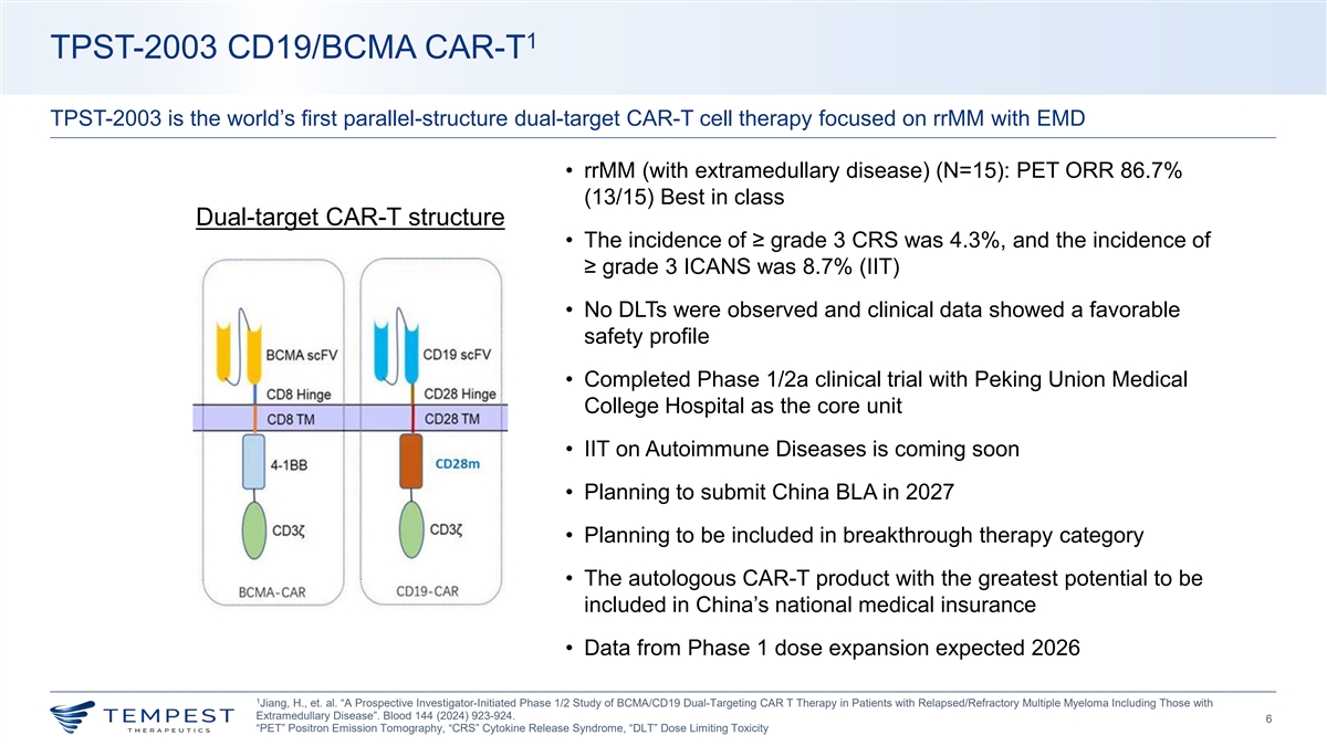 TPST-2003 Dual CAR-T for rrMM: CD19/BCMA Dual Targeting 1 Jiang, H., et. al. “A Prospective Investigator-Initiated Phase 1/2 Study of BCMA/CD19 Dual-Targeting CAR T Therapy in Patients with Relapsed/Refractory 7 Multiple Myeloma Including Those with Extramedullary Disease”. Blood 144 (2024) 923-924.