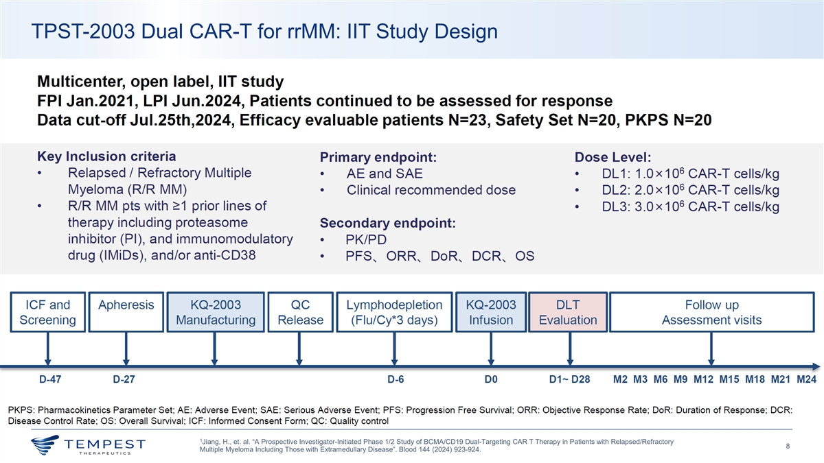 TPST-2003 Dual CAR-T for rrMM: IIT Study Design 1 Jiang, H., et. al. “A Prospective Investigator-Initiated Phase 1/2 Study of BCMA/CD19 Dual-Targeting CAR T Therapy in Patients with Relapsed/Refractory 8 Multiple Myeloma Including Those with Extramedullary Disease”. Blood 144 (2024) 923-924.