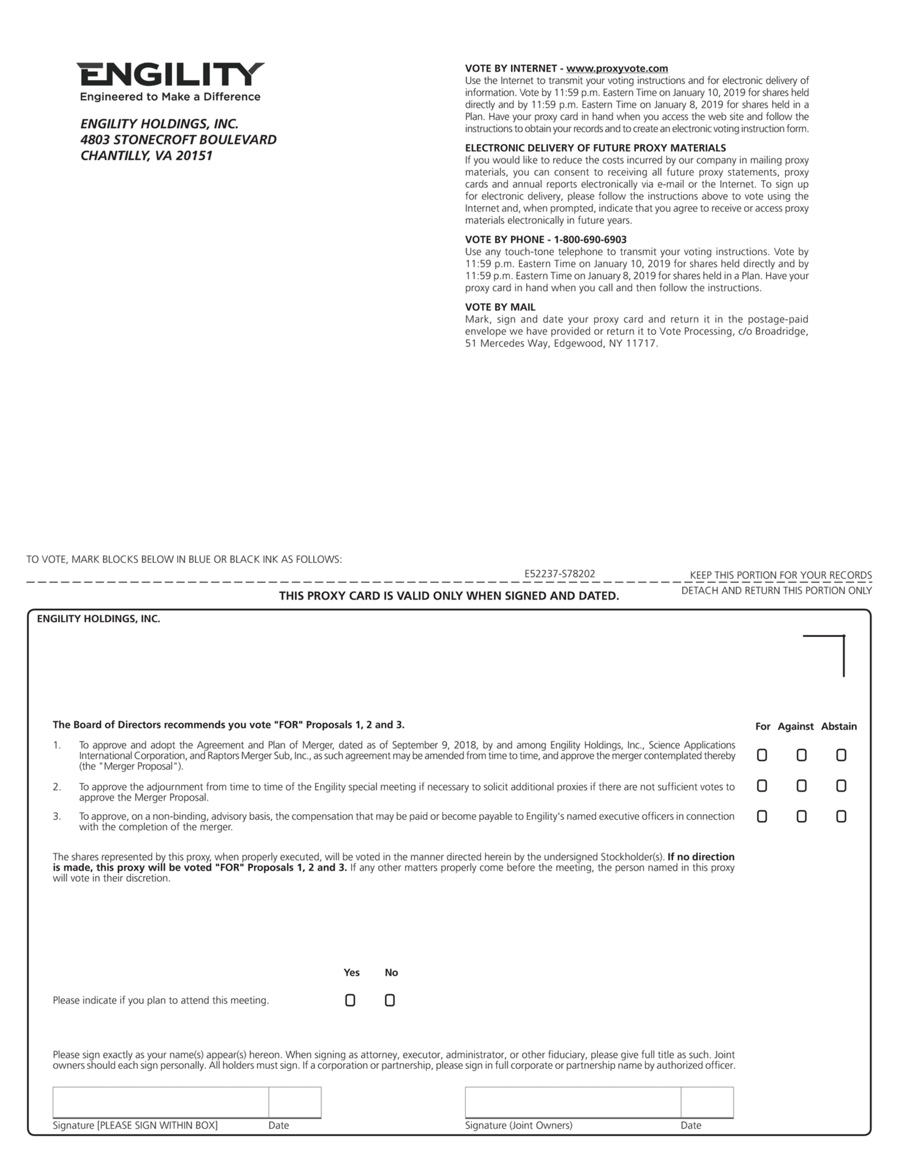 | • | to consider and vote on a proposal to adopt and approve the merger agreement, dated September 9, 2018, among Science Applications International Corporation, Raptors Merger Sub, Inc., and Engility Holdings, Inc., which we refer to as the merger agreement, a copy of which is attached as Annex A to the joint proxy statement/prospectus accompanying this notice, as such agreement may be amended from time to time, and approve the merger contemplated thereby (we refer to this proposal as the Engility merger proposal); |