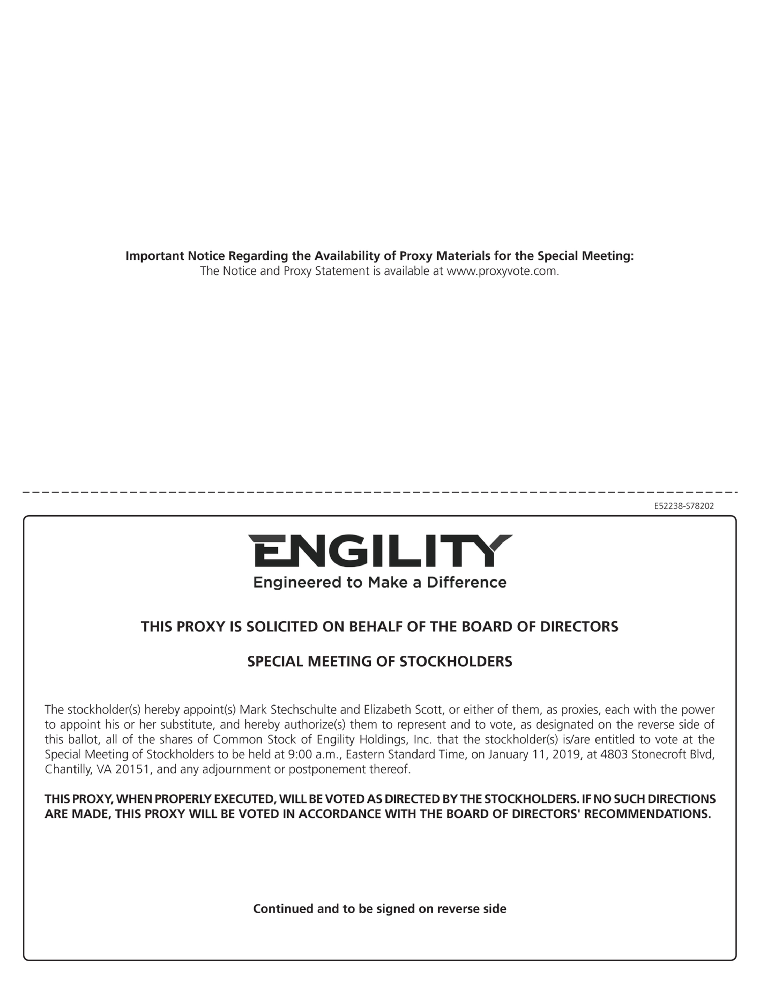 We are pleased to invite you to attend the special meeting of the Engility stockholders, which will be held at 4803 Stonecroft Boulevard, Chantilly, Virginia 20151 on January 11, 2019, at 9:00 a.m., local time, which we refer to as the Engility special meeting, for the following purposes:
