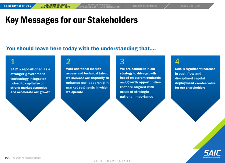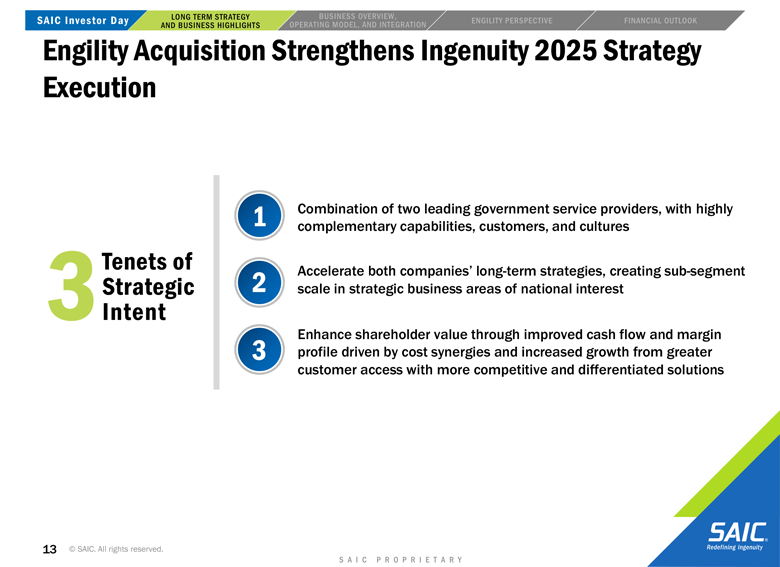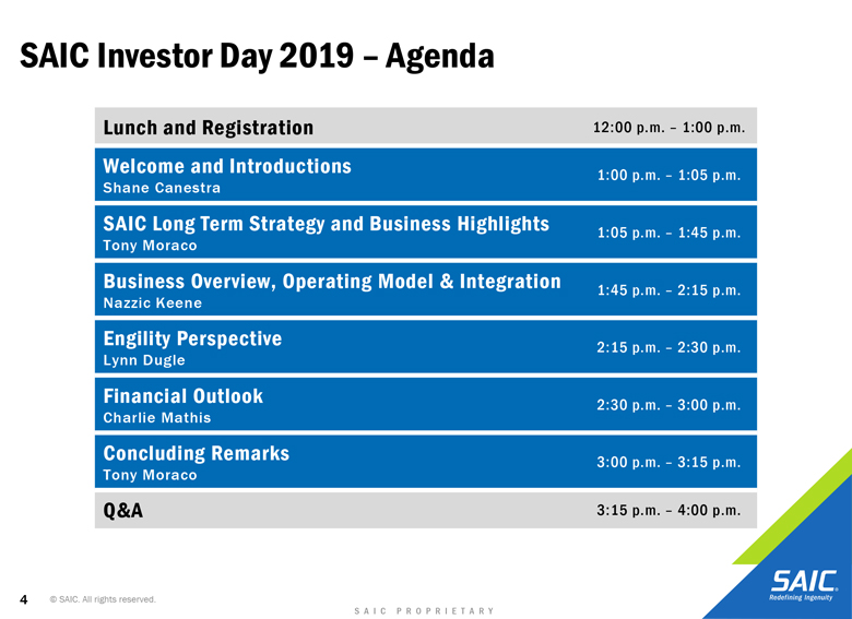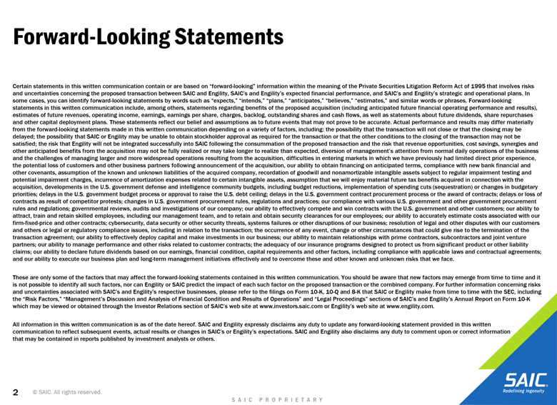 actual results or changes in SAIC’s or Engility’s expectations. SAIC and Engility also disclaims any duty to comment upon or correct information that may be contained in reports published by investment analysts or others. 2