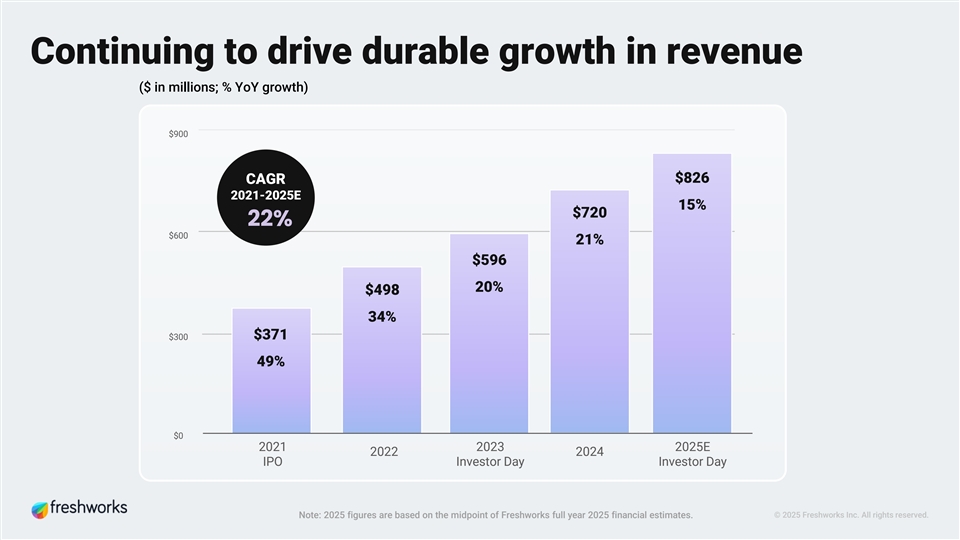 Continuing to drive durable growth in revenue ($ in millions; % YoY growth) $900 $826 CAGR 2021-2025E 15% $720 22% $600 21% $596 20% $498 34% $300 $371 49% $0 2021 2023 2025E 2022 2024 IPO Investor Day Investor Day © 2025 Freshworks Inc. All rights reserved. Note: 2025 figures are based on the midpoint of Freshworks full year 2025 financial estimates.