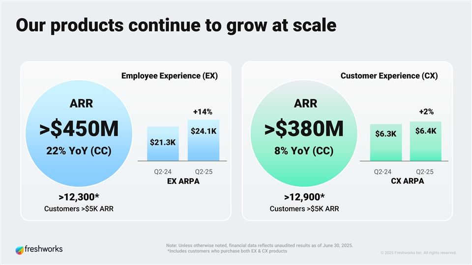 Our products continue to grow at scale Employee Experience (EX) Customer Experience (CX) ARR ARR +14% +2% $6.4K $24.1K >$450M >$380M $6.3K $21.3K 22% YoY (CC) 8% YoY (CC) Q2-24 Q2-25 Q2-24 Q2-25 EX ARPA CX ARPA >12,300* >12,900* Customers >$5K ARR Customers >$5K ARR Note: Unless otherwise noted, financial data reflects unaudited results as of June 30, 2025. *Includes customers who purchase both EX & CX products © 2025 Freshworks Inc. All rights reserved.