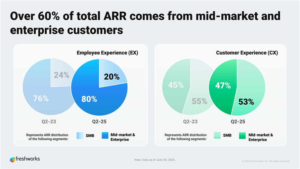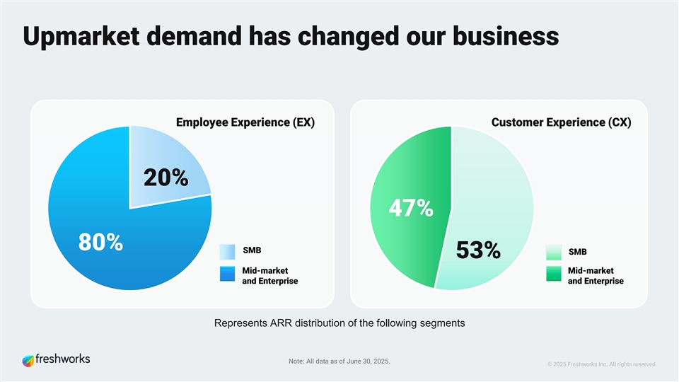 Upmarket demand has changed our business Employee Experience (EX) Customer Experience (CX) 20% 47% 80% SMB SMB 53% Mid-market Mid-market and Enterprise and Enterprise Represents ARR distribution of the following segments Note: All data as of June 30, 2025. © 2025 Freshworks Inc. All rights reserved.
