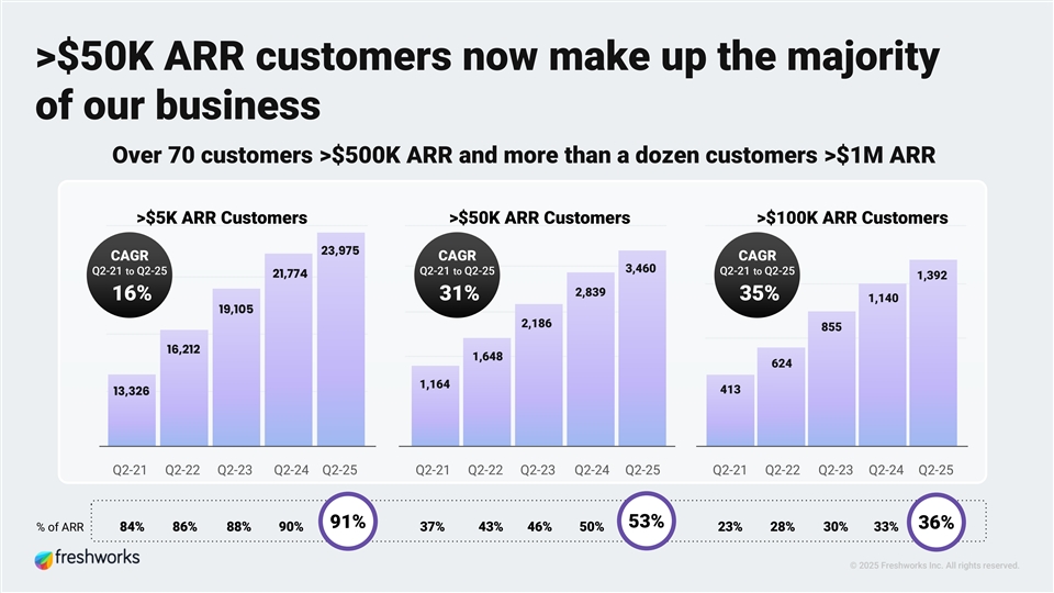 >$50K ARR customers now make up the majority of our business Over 70 customers >$500K ARR and more than a dozen customers >$1M ARR >$5K ARR Customers >$50K ARR Customers >$100K ARR Customers 23,975 CAGR CAGR CAGR 3,460 Q2-21 to Q2-25 Q2-21 to Q2-25 Q2-21 to Q2-25 21,774 1,392 2,839 16% 31% 35% 1,140 19,105 2,186 855 16,212 1,648 624 1,164 413 13,326 Q2-21 Q2-22 Q2-23 Q2-24 Q2-25 Q2-21 Q2-22 Q2-23 Q2-24 Q2-25 Q2-21 Q2-22 Q2-23 Q2-24 Q2-25 91% 53% 36% % of ARR 84% 86% 88% 90% 91% 37% 43% 46% 50% 53% 23% 28% 30% 33% 36% © 2025 Freshworks Inc. All rights reserved.