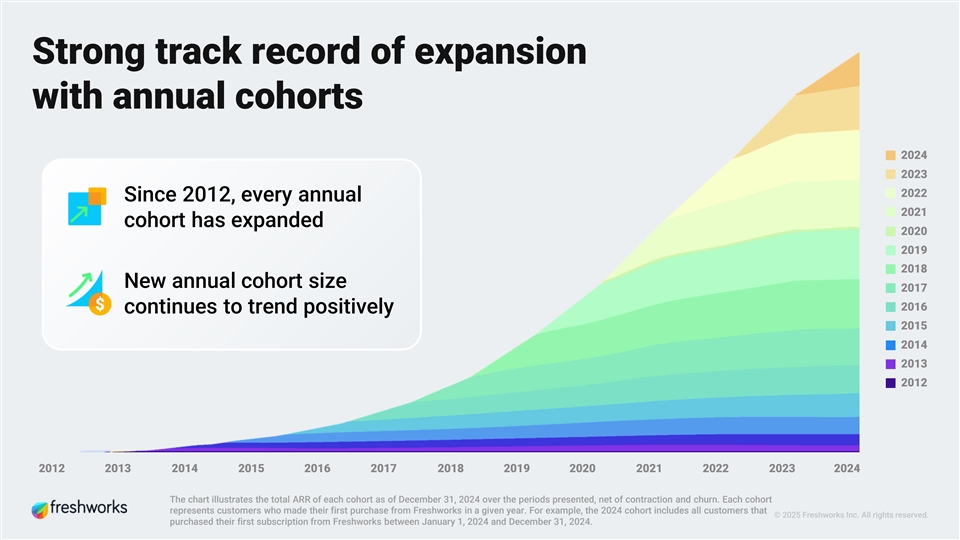 Strong track record of expansion with annual cohorts 2024 2023 2022 Since 2012, every annual 2021 cohort has expanded 2020 2019 2018 New annual cohort size 2017 2016 continues to trend positively 2015 2014 2013 2012 2012 2013 2014 2015 2016 2017 2018 2019 2020 2021 2022 2023 2024 The chart illustrates the total ARR of each cohort as of December 31, 2024 over the periods presented, net of contraction and churn. Each cohort represents customers who made their first purchase from Freshworks in a given year. For example, the 2024 cohort includes all customers that © 2025 Freshworks Inc. All rights reserved. purchased their first subscription from Freshworks between January 1, 2024 and December 31, 2024.