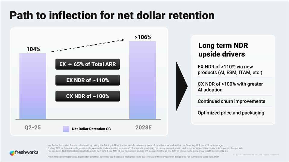 Path to inflection for net dollar retention >106% Long term NDR 104% upside drivers EX 65% of Total ARR EX NDR of >110% via new products (AI, ESM, ITAM, etc.) EX NDR of ~110% CX NDR of >100% with greater AI adoption CX NDR of ~100% Continued churn improvements Optimized price and packaging Q2-25 2028E Net Dollar Retention CC Net Dollar Retention Rate is calculated by taking the Ending ARR of the cohort of customers from 12 months prior divided by the Entering ARR from 12 months ago. Ending ARR includes upsells, cross-sells, renewals and expansion as a result of acquisitions during the measurement period and is net of any contraction or attrition over this period. For example, Net Dollar Retention Rate would be 110% if the ARR of our customers ending Q2-24 was $100 and the ARR of those customers grew to $110 ending Q2-25. © 2025 Freshworks Inc. All rights reserved. Note: Net Dollar Retention adjusted for constant currency are based on exchange rates in effect as of the comparison period end for currencies other than USD.