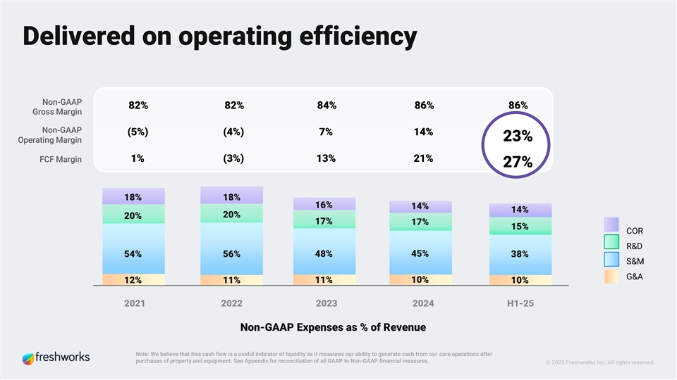 Delivered on operating efficiency Non-GAAP 82% 82% 84% 86% 86% Gross Margin Non-GAAP (5%) (4%) 7% 14% 23% Operating Margin FCF Margin 1% (3%) 13% 21% 27% 18% 18% 16% 14% 14% 20% 20% 17% 17% 15% COR R&D 54% 56% 48% 45% 38% S&M G&A 12% 11% 11% 10% 10% 2021 2022 2023 2024 H1-25 Non-GAAP Expenses as % of Revenue Note: We believe that free cash flow is a useful indicator of liquidity as it measures our ability to generate cash from our core operations after purchases of property and equipment. See Appendix for reconciliation of all GAAP to Non-GAAP financial measures. © 2025 Freshworks Inc. All rights reserved.