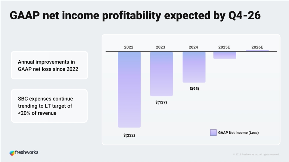 GAAP net income profitability expected by Q4-26 2022 2023 2024 2025E 2026E Annual improvements in GAAP net loss since 2022 $(95) SBC expenses continue $(137) trending to LT target of <20% of revenue GAAP Net Income (Loss) $(232) © 2025 Freshworks Inc. All rights reserved.