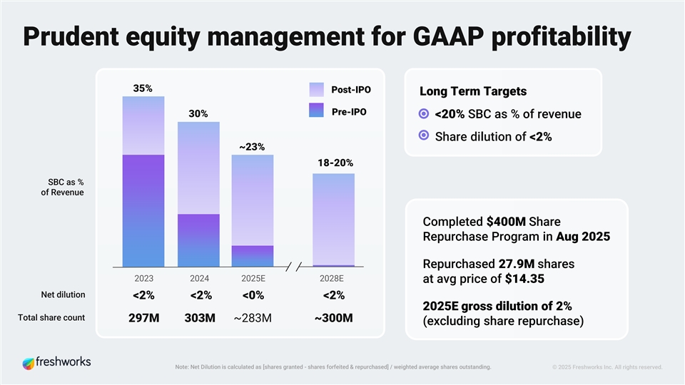 Prudent equity management for GAAP profitability 35% Post-IPO Long Term Targets Pre-IPO 30% <20% SBC as % of revenue Share dilution of <2% ~23% 18-20% SBC as % of Revenue Completed $400M Share Repurchase Program in Aug 2025 Repurchased 27.9M shares 2023 2024 2025E 2028E at avg price of $14.35 Net dilution <2% <2% <0% <2% 2025E gross dilution of 2% Total share count 297M 303M ~283M ~300M (excluding share repurchase) Note: Net Dilution is calculated as [shares granted - shares forfeited & repurchased] / weighted average shares outstanding. © 2025 Freshworks Inc. All rights reserved.