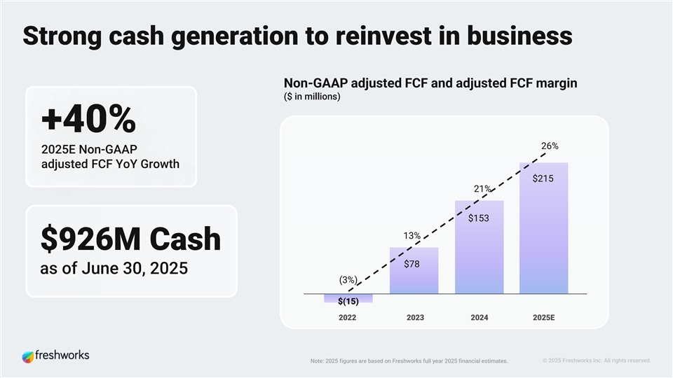 Strong cash generation to reinvest in business Non-GAAP adjusted FCF and adjusted FCF margin ($ in millions) +40% 26% 2025E Non-GAAP adjusted FCF YoY Growth $215 21% $153 13% $926M Cash $78 as of June 30, 2025 (3%) $(15) 2022 2023 2024 2025E © 2025 Freshworks Inc. All rights reserved. Note: 2025 figures are based on Freshworks full year 2025 financial estimates.