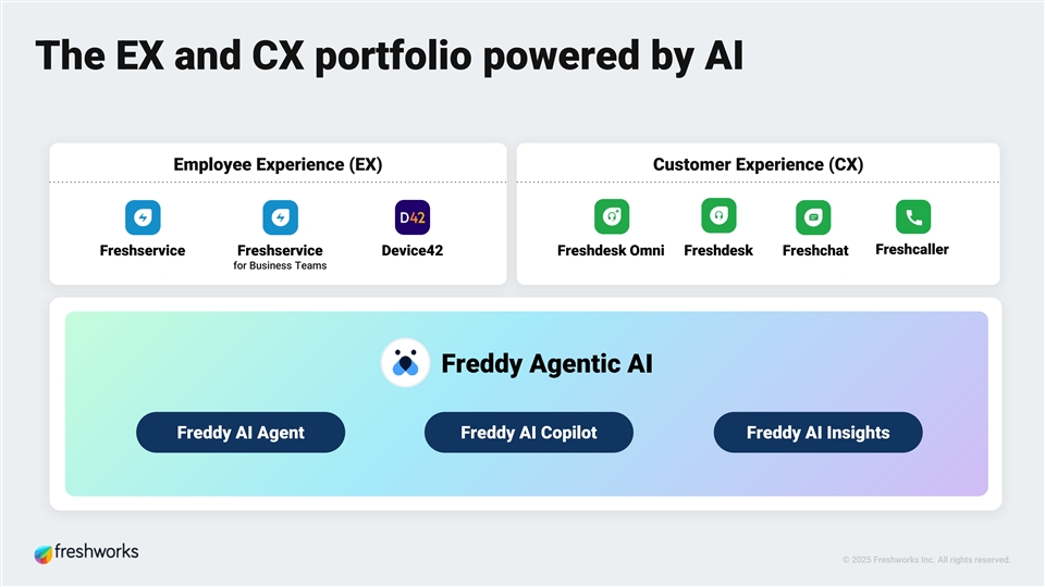 The EX and CX portfolio powered by AI Employee Experience (EX) Customer Experience (CX) Freshservice Freshservice Device42 Freshdesk Omni Freshdesk Freshchat Freshcaller for Business Teams Freddy Agentic AI Freddy AI Agent Freddy AI Copilot Freddy AI Insights © 2025 Freshworks Inc. All rights reserved.