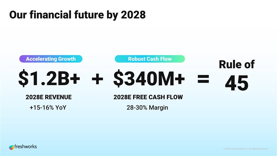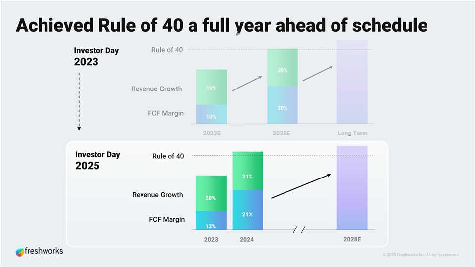 Achieved Rule of 40 a full year ahead of schedule Rule of 40 Investor Day 2023 20% 19% Revenue Growth 20% FCF Margin 10% 2023E 2025E Long Term Investor Day Rule of 40 2025 21% Revenue Growth 20% 21% FCF Margin 13% 2028E 2023 2024 © 2025 Freshworks Inc. All rights reserved.