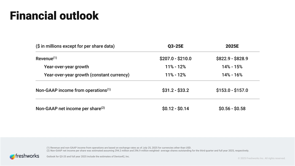 Financial outlook ($ in millions except for per share data) Q3-25E 2025E (1) Revenue $207.0 - $210.0 $822.9 - $828.9 Year-over-year growth 11% - 12% 14% - 15% Year-over-year growth (constant currency) 11% - 12% 14% - 16% (1) Non-GAAP income from operations $31.2 - $33.2 $153.0 - $157.0 (2) Non-GAAP net income per share $0.12 - $0.14 $0.56 - $0.58 (1) Revenue and non-GAAP income from operations are based on exchange rates as of July 25, 2025 for currencies other than USD. (2) Non-GAAP net income per share was estimated assuming 294.2 million and 296.9 million weighted- average shares outstanding for the third quarter and full year 2025, respectively. Outlook for Q3-25 and full year 2025 include the estimates of Device42, Inc. © 2025 Freshworks Inc. All rights reserved.